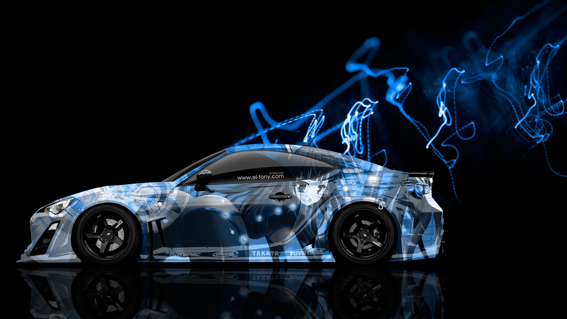 Description: A car with a blue design on it is shown in the dark with a reflection of the car on the floor.