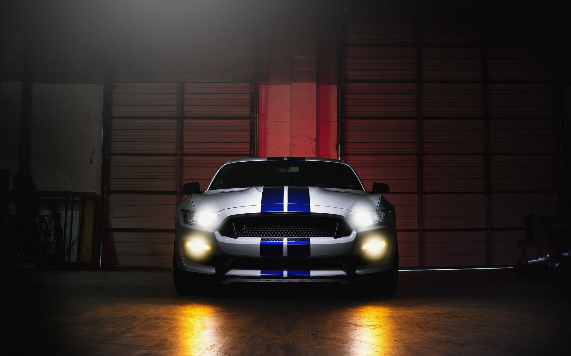 Description: A car with a blue stripe on it in a garage with a red wall and a red door behind it.