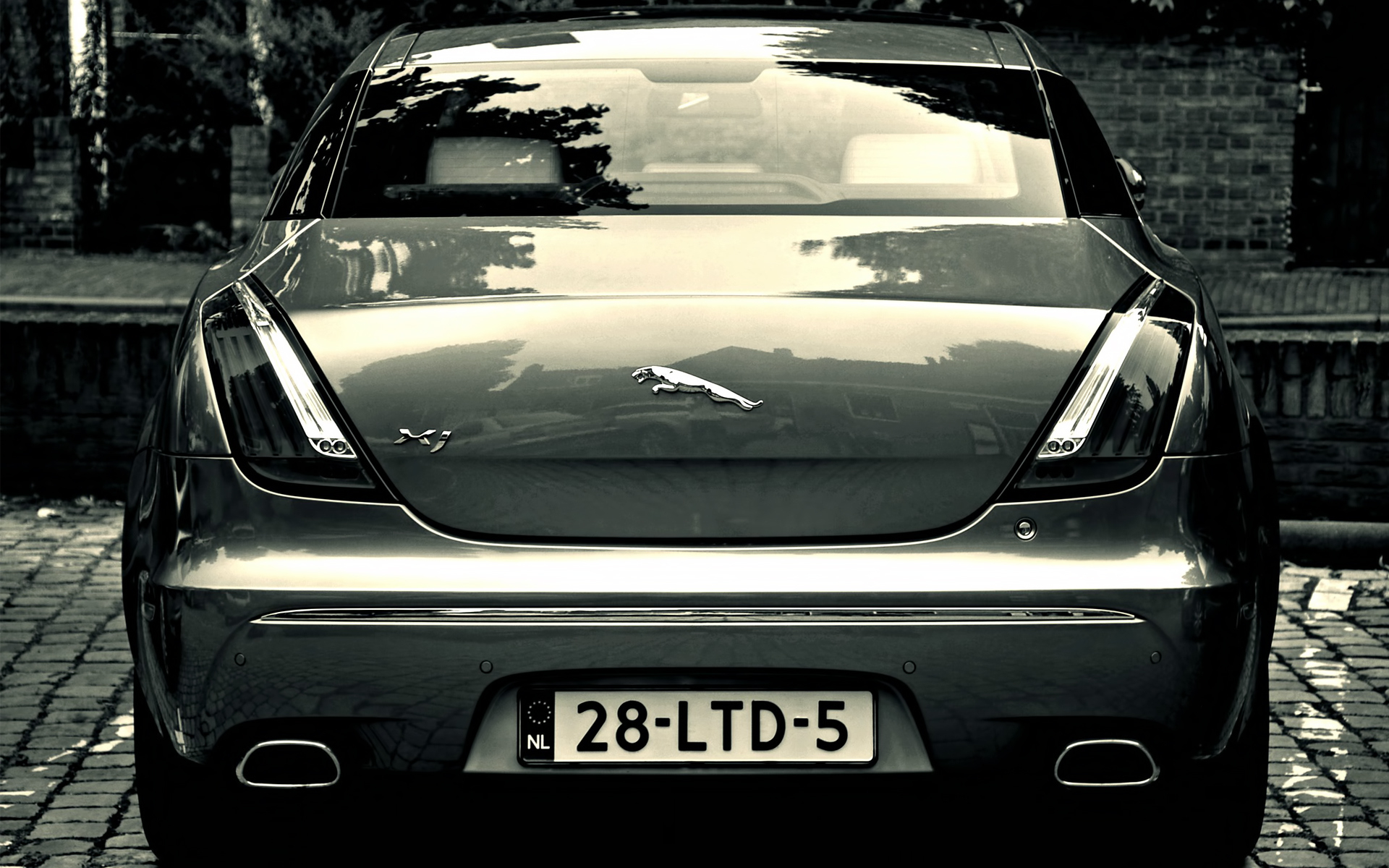 Description: A car parked on a brick road next to a tree and a fence with a bird on it's back end.