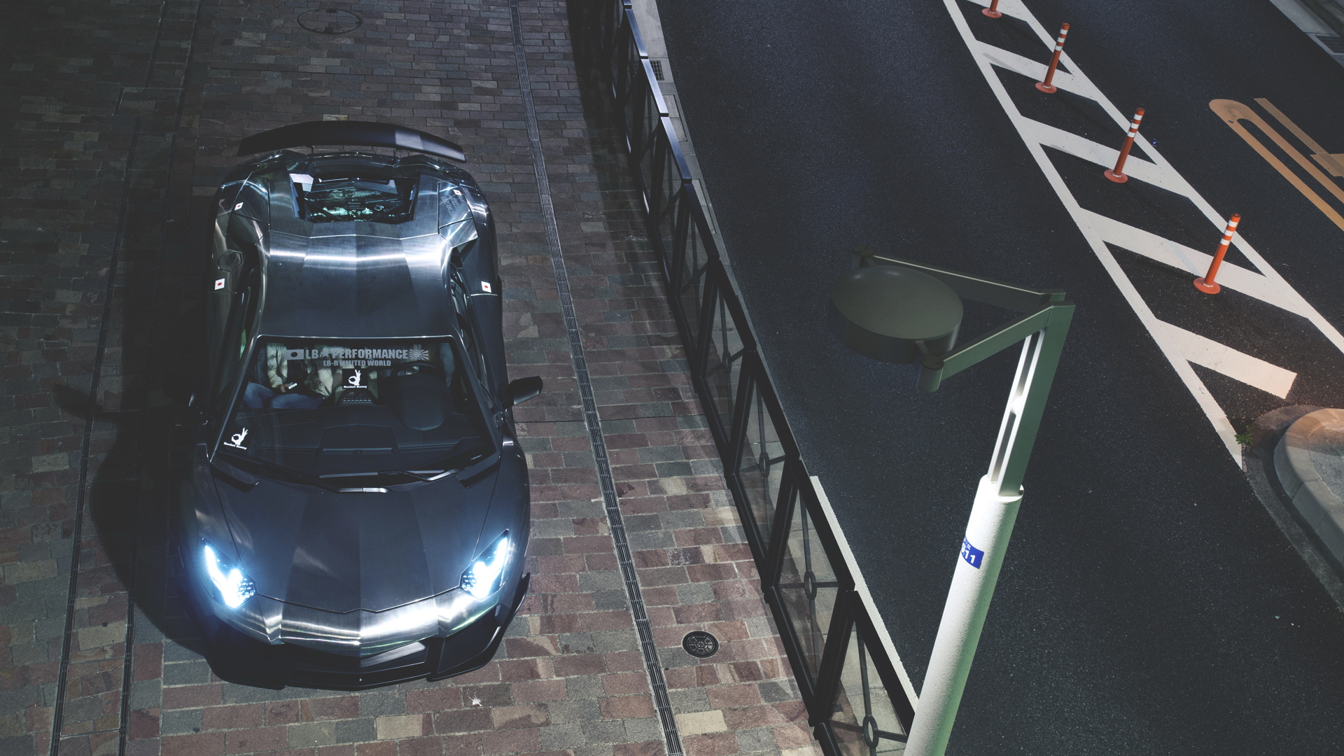 Description: A car parked on a brick road next to a fence and a street sign with a traffic light on it.