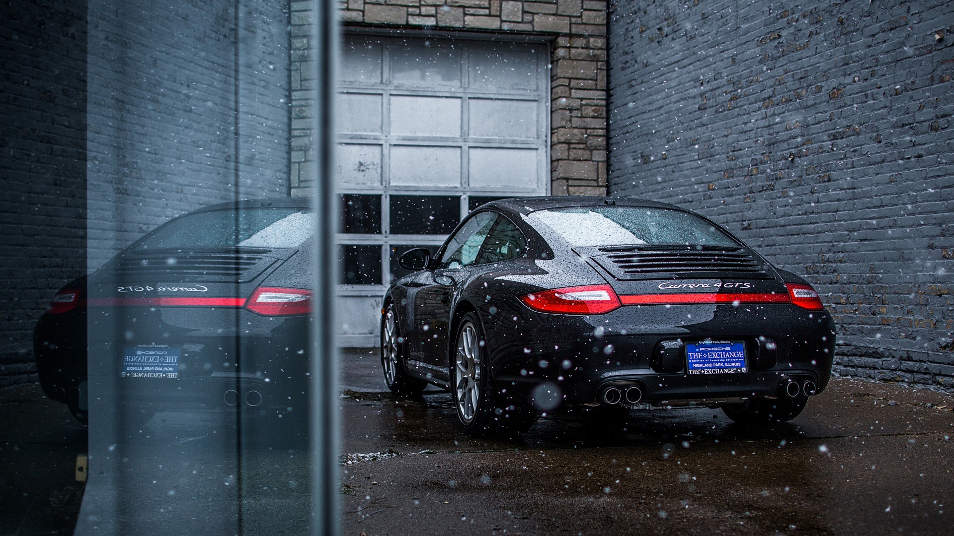 Description: A car parked in front of a building in the snow with a parking meter in front of it and a brick wall behind it.