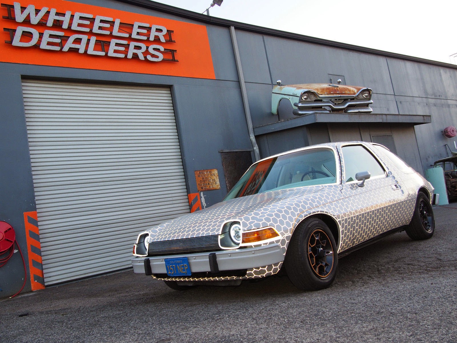 Description: A car parked in front of a building with a sign on it's side that says wheeler dealers.