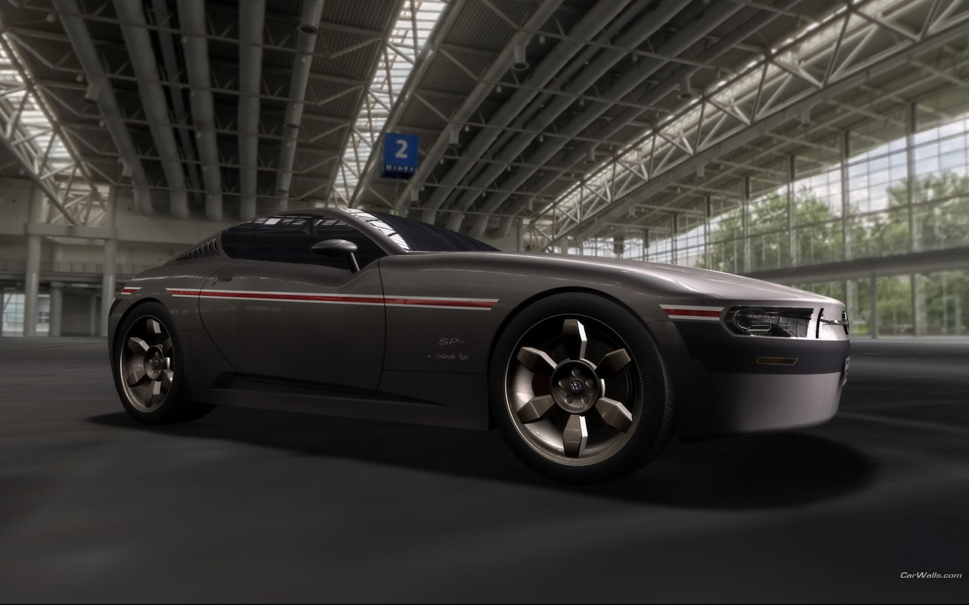 Description: A car is shown in a large building with a lot of windows and a ceiling that has a lot of windows.
