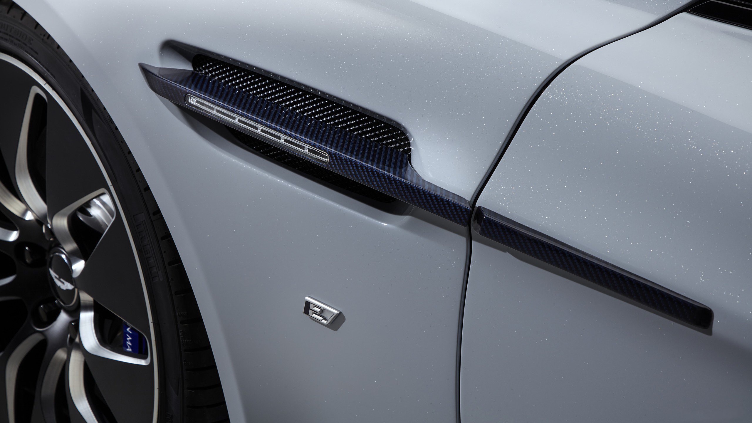 Description: A close up of a car's front bumper and brake lights with a black background and a white background.