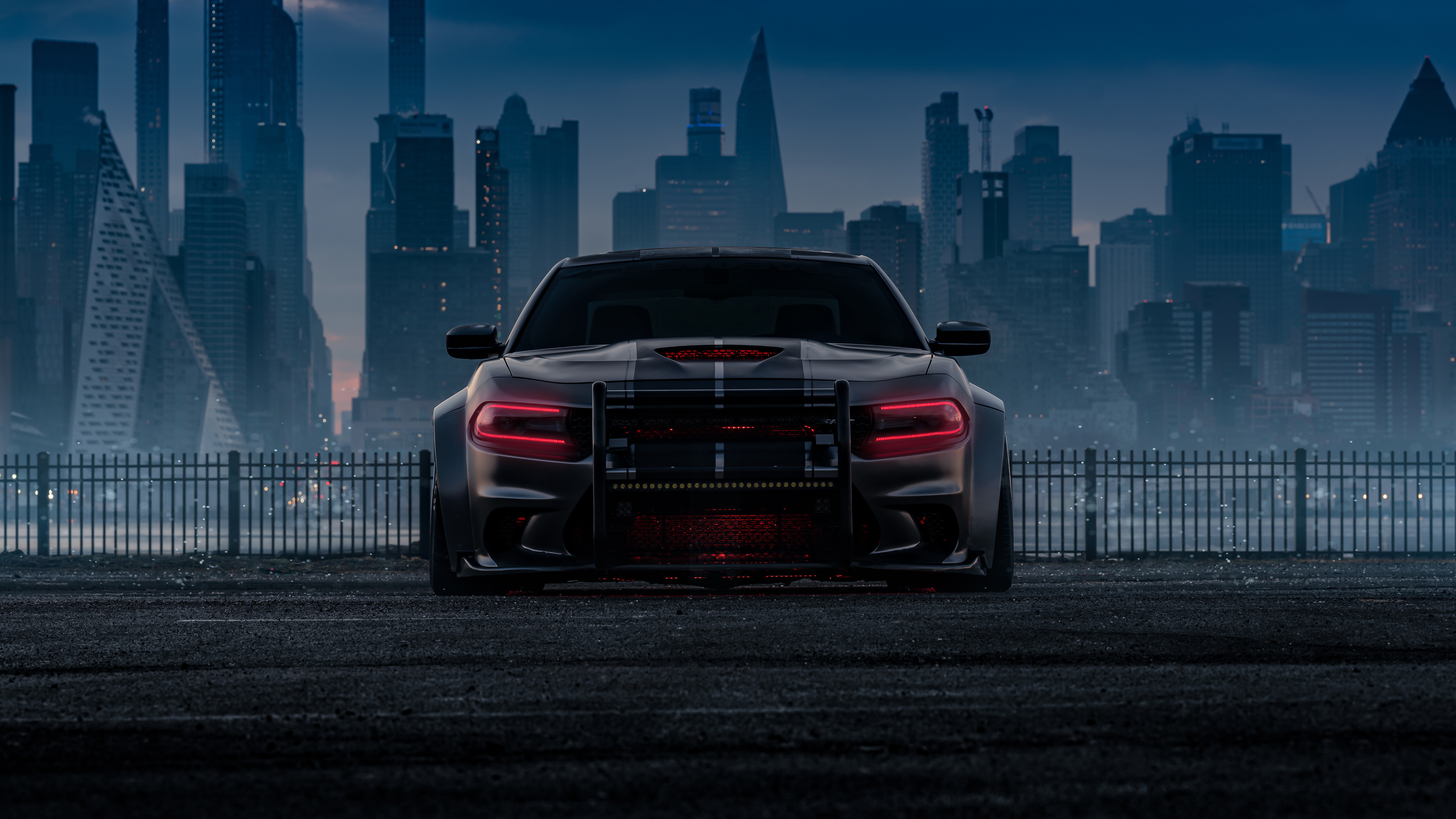 Description: A car parked in front of a city skyline at night with the lights on and the hood up.