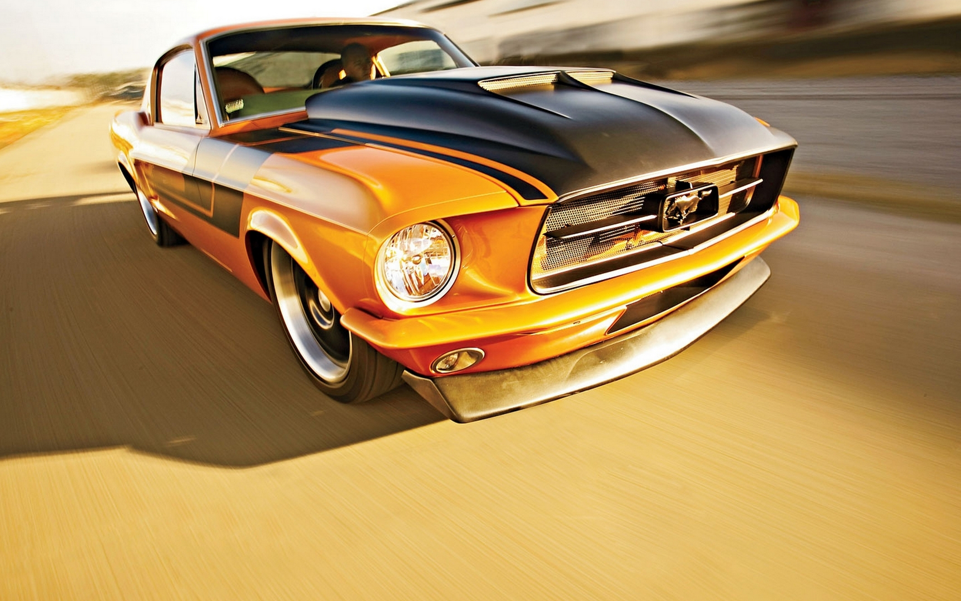 Description: A car driving down a road with a lot of lights on it's headlight and a hood.