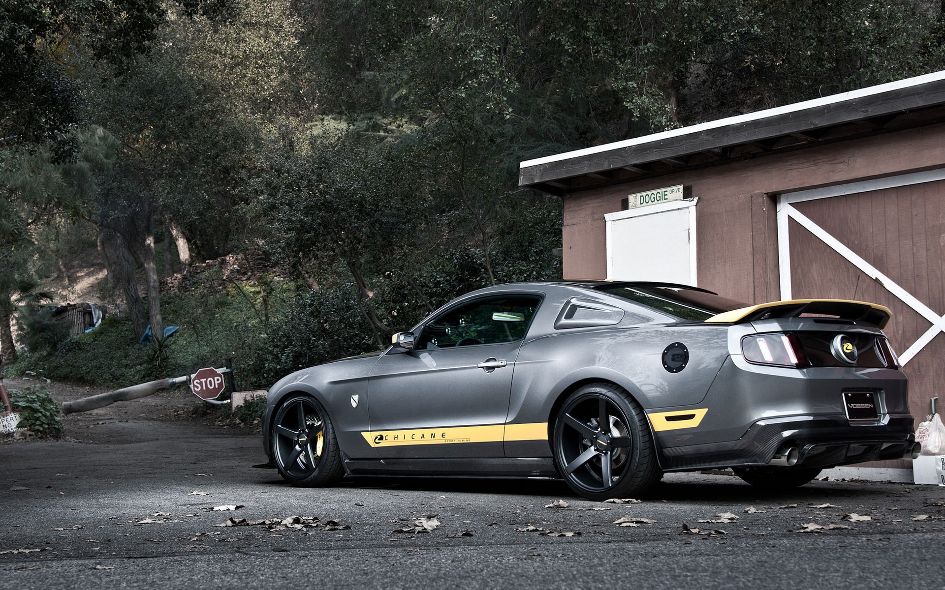 Description: A car parked in front of a garage with a yellow stripe on it's side and a brown building behind it.
