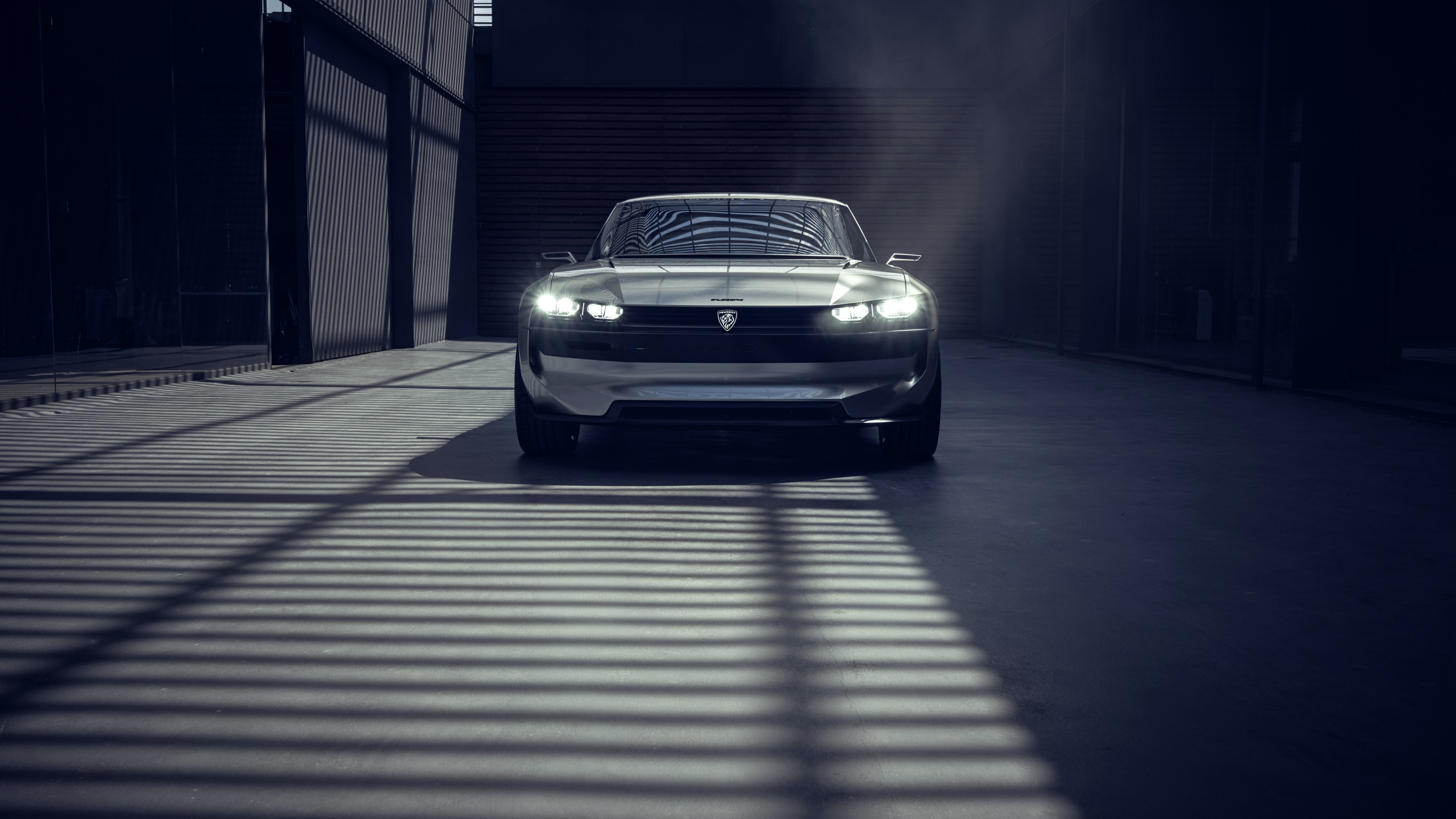 Description: A car is parked in a dark alley with its headlights on and the hood up and the hood down.