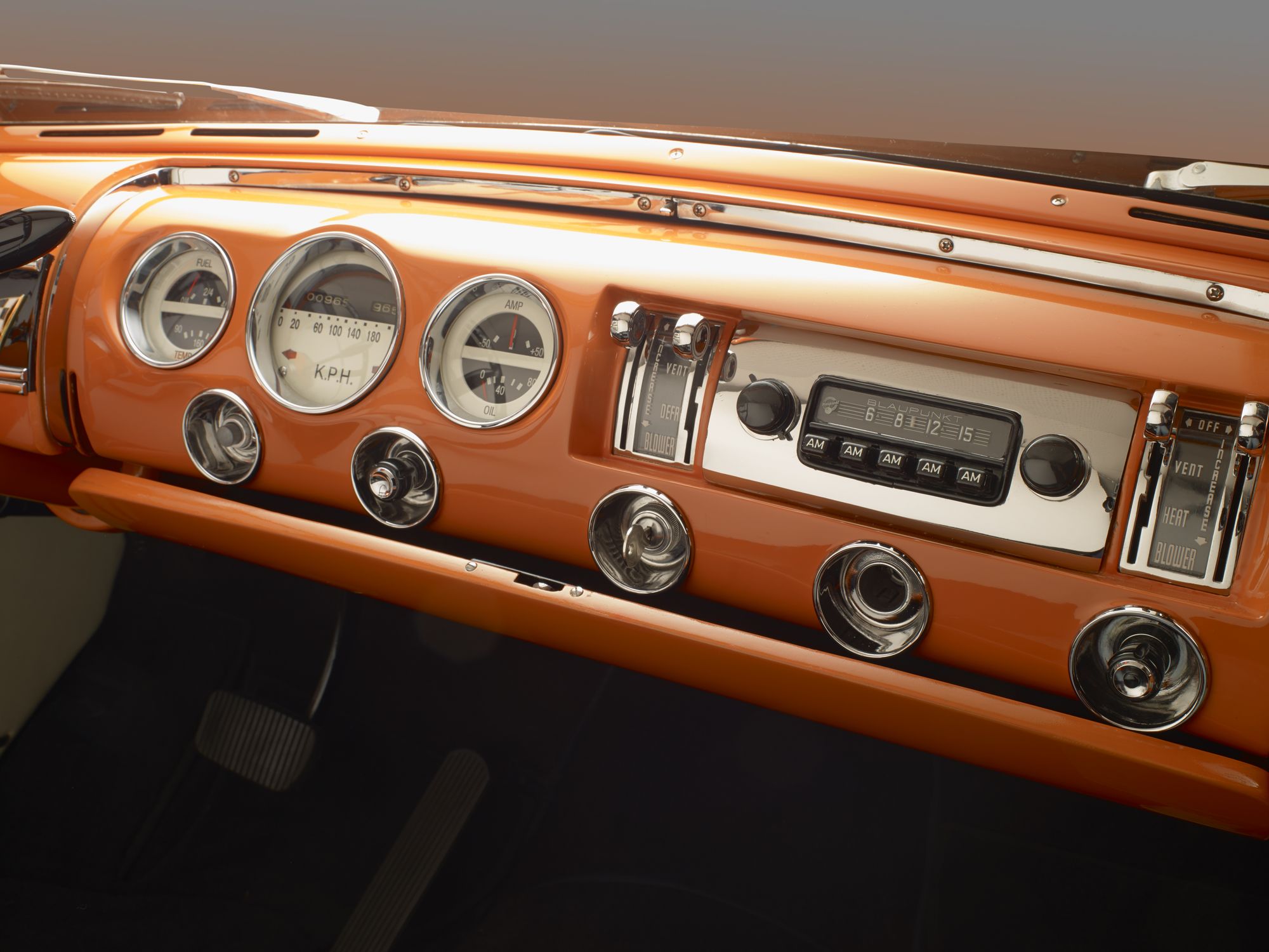 Description: A dashboard of a car with a clock and other gauges on it's dash board and dash board.