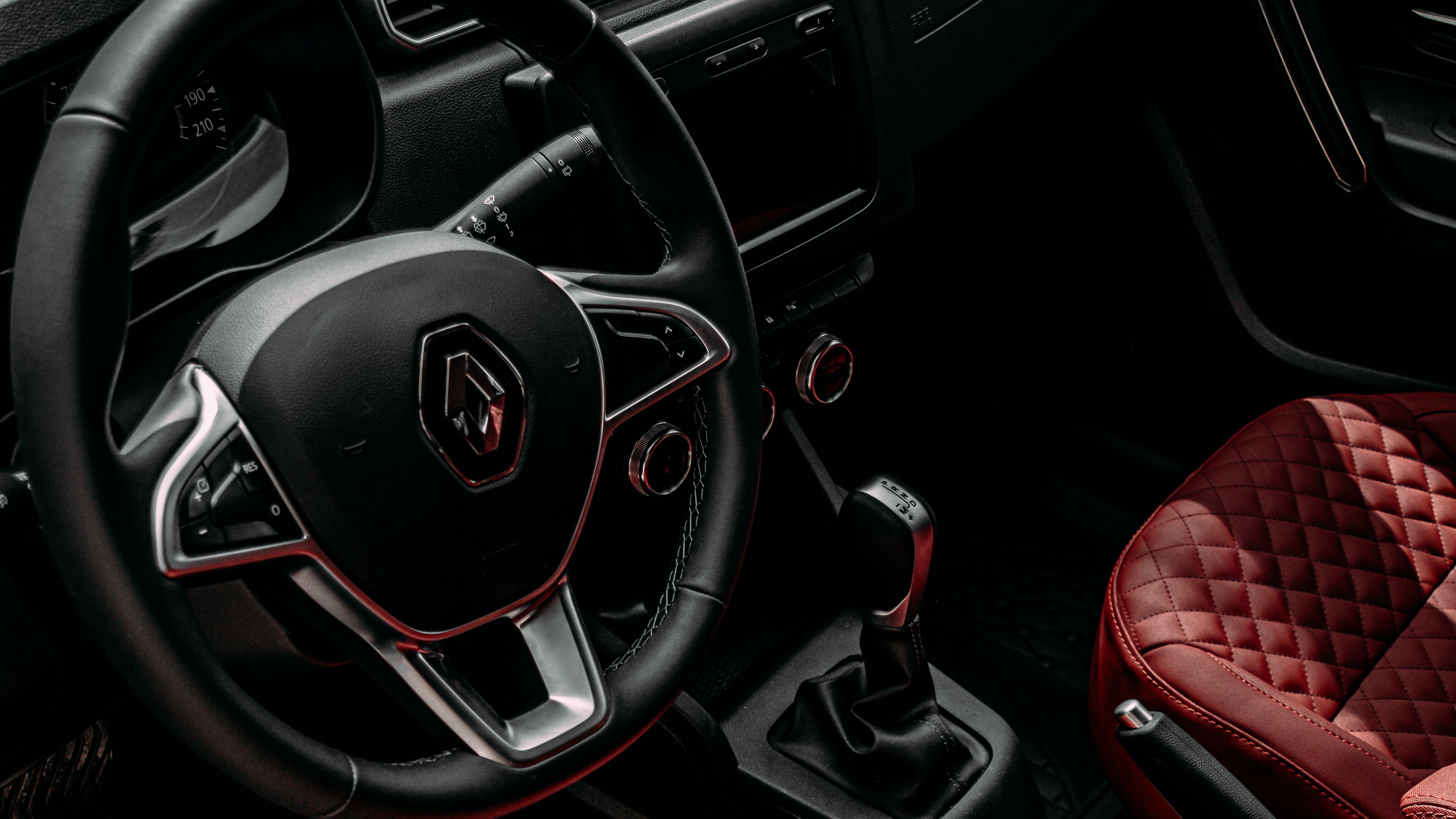 Description: A car dashboard with a red leather seat and a black steering wheel cover and a red stitched seat.