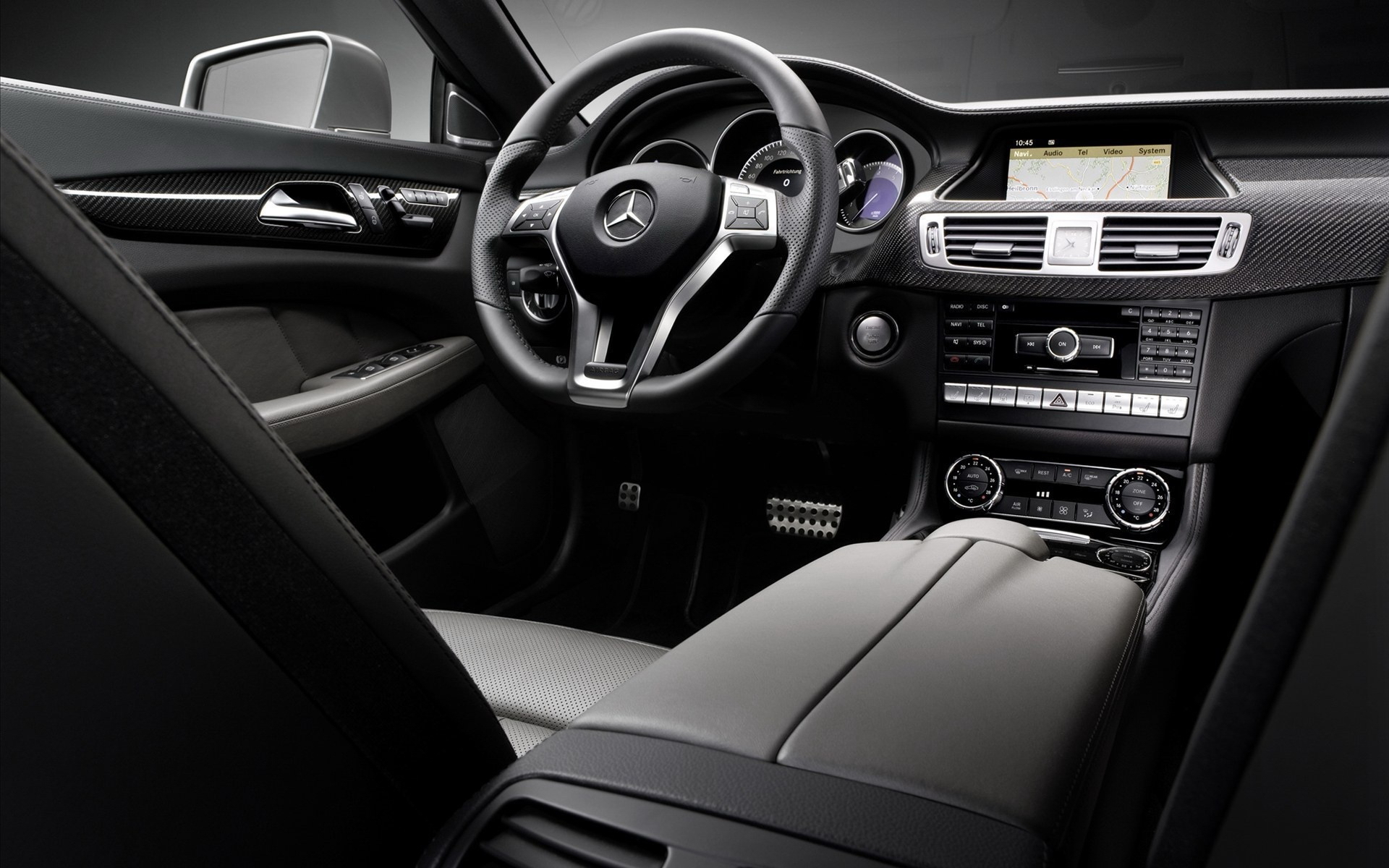 Description: A car dashboard with a steering wheel and dashboard controls in a vehicle with black leather seats and a black dash board.