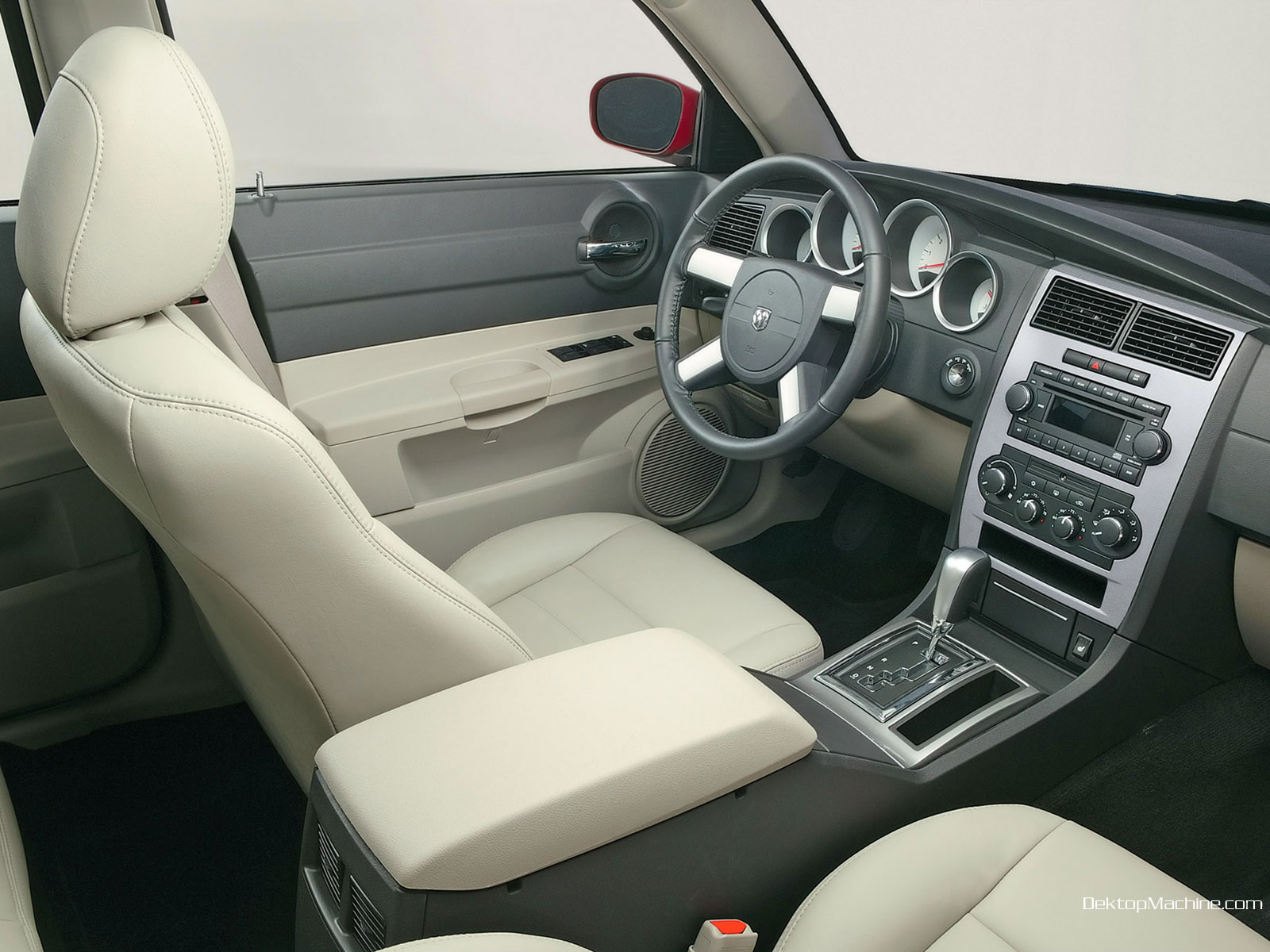 Description: A car dashboard with a steering wheel and dashboard controls and a dash board with a dash light on it.