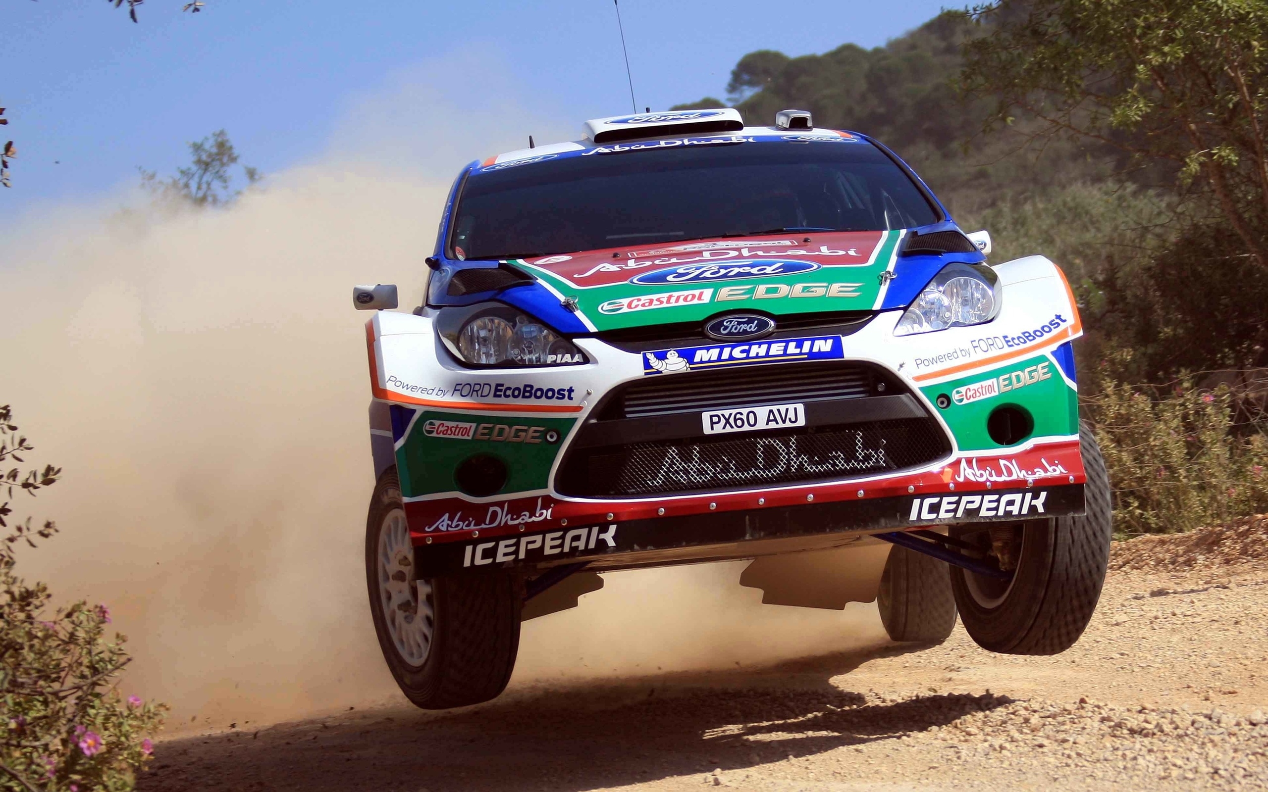 Description: A car driving on a dirt road with dust coming off the side of it and trees in the background.