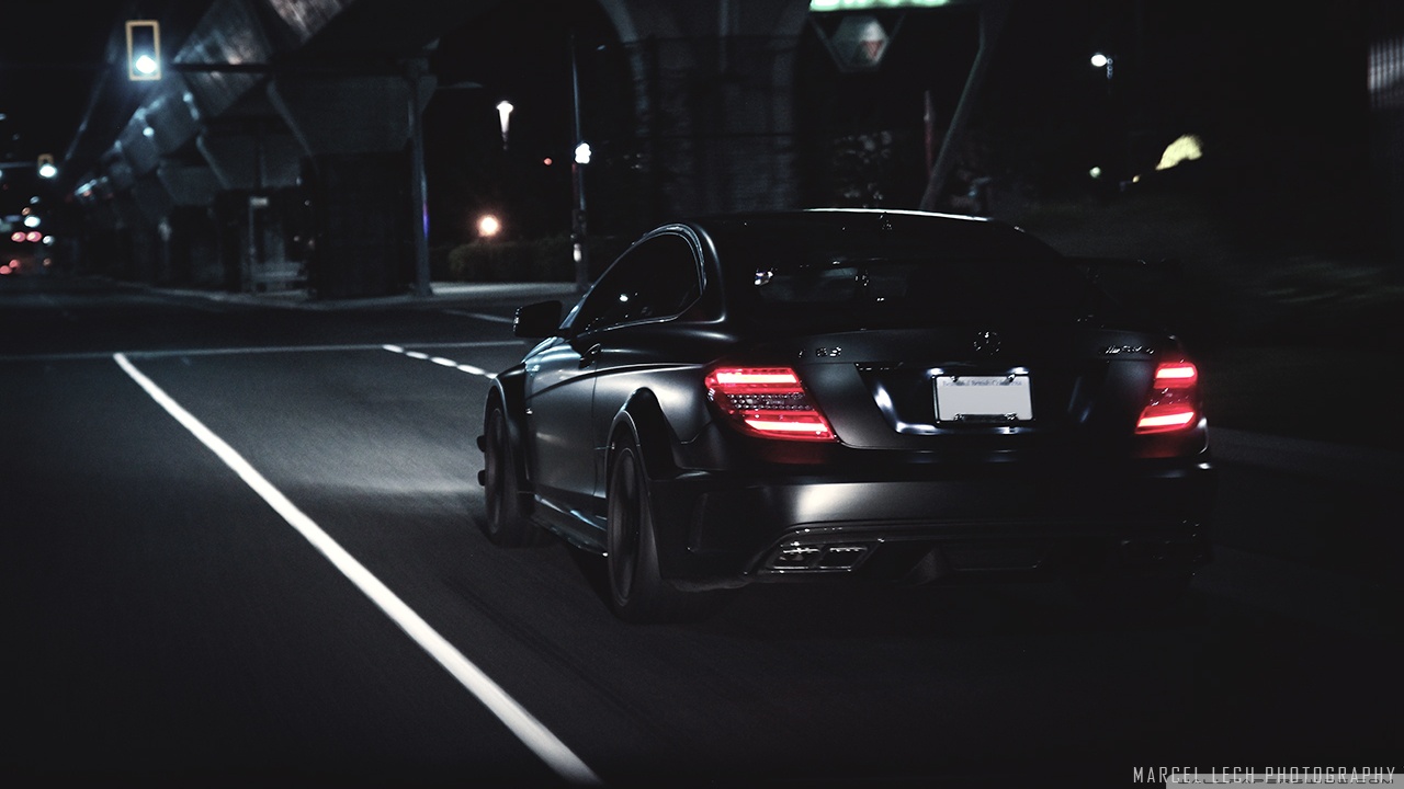 Description: A car driving down a street at night with its lights on and the back lights on and the tail lights on.