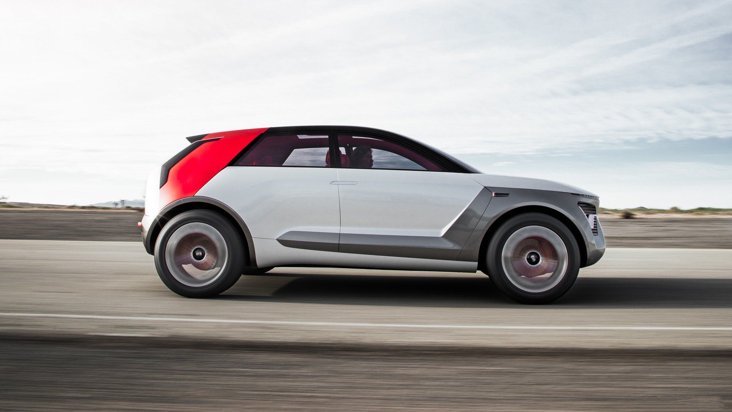 Description: A car driving down a road with a sky background and clouds in the background.
