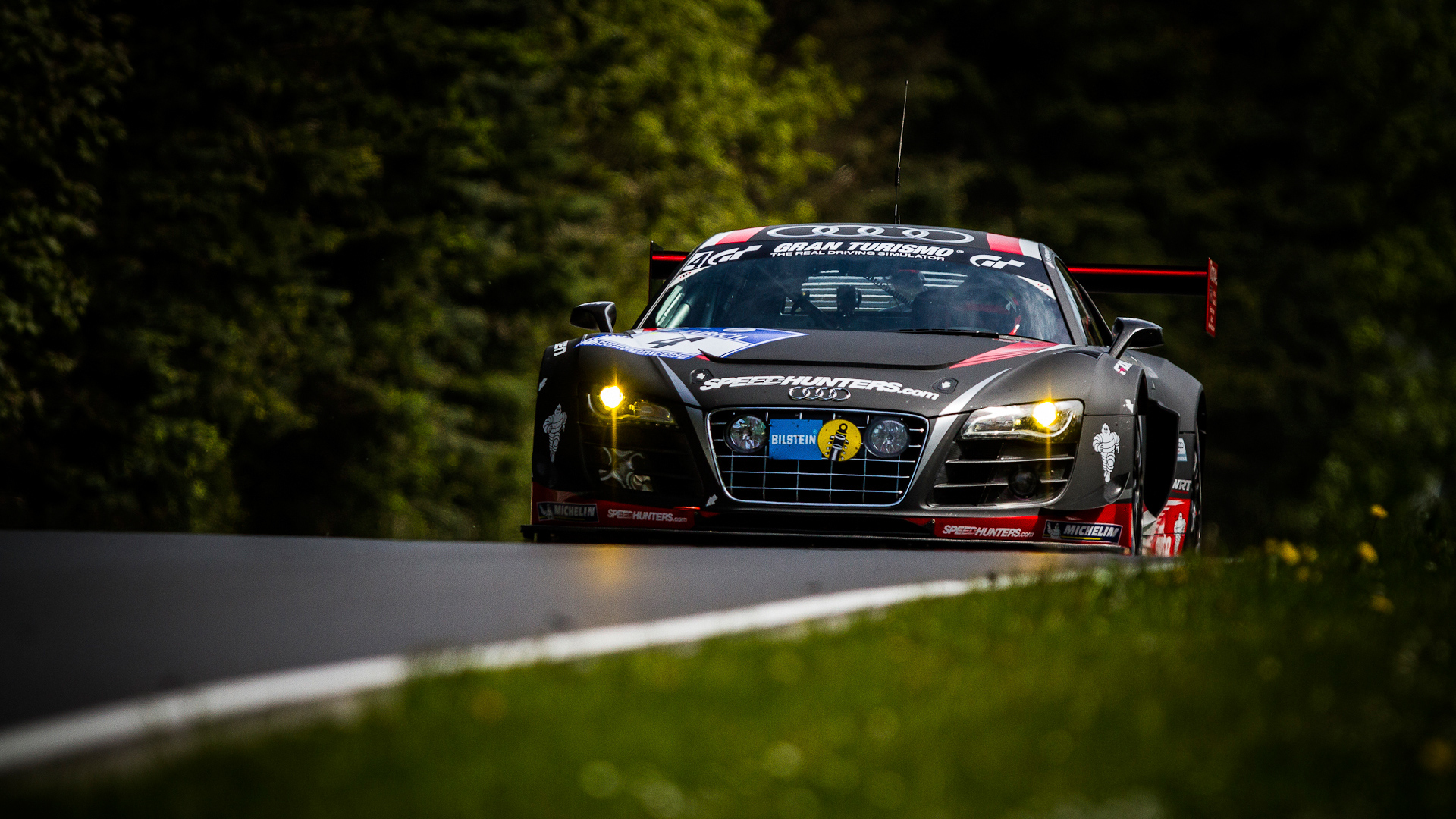 Description: A car driving down a road with trees in the background and grass in the foreground.