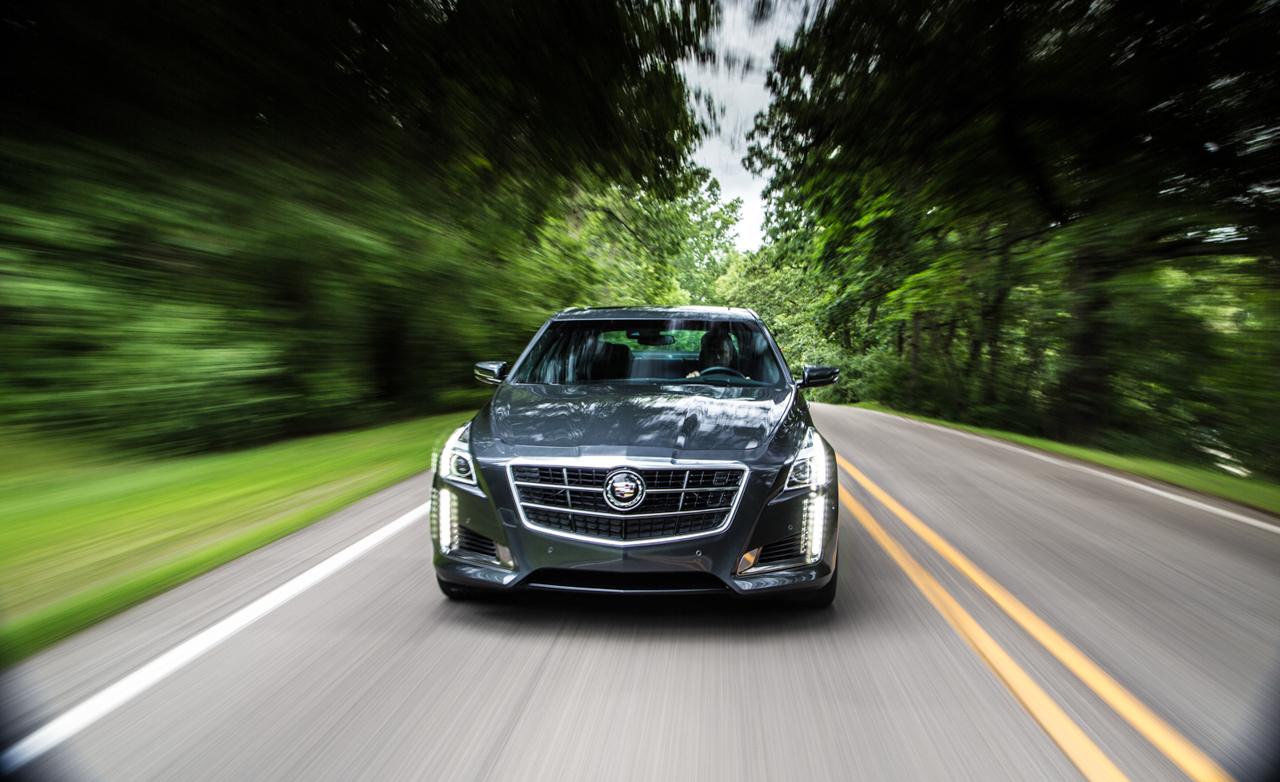 Description: A car driving down a road with trees in the background and a blurry image of the front end of the car.