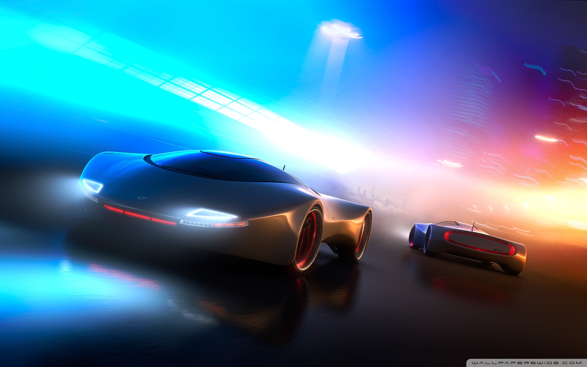 Description: A car driving down a street next to another car on a road with lights on it and a neon light behind it.