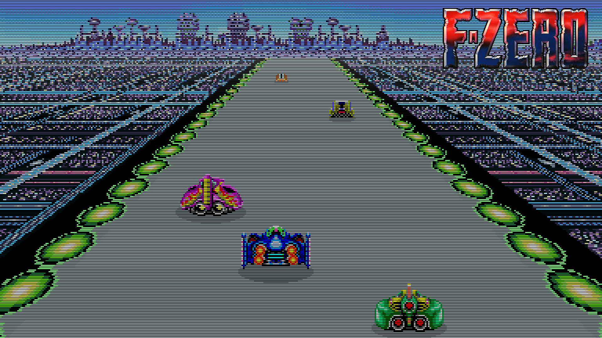 Description: A video game with a car driving down a track with a sign that says ezgo on it.