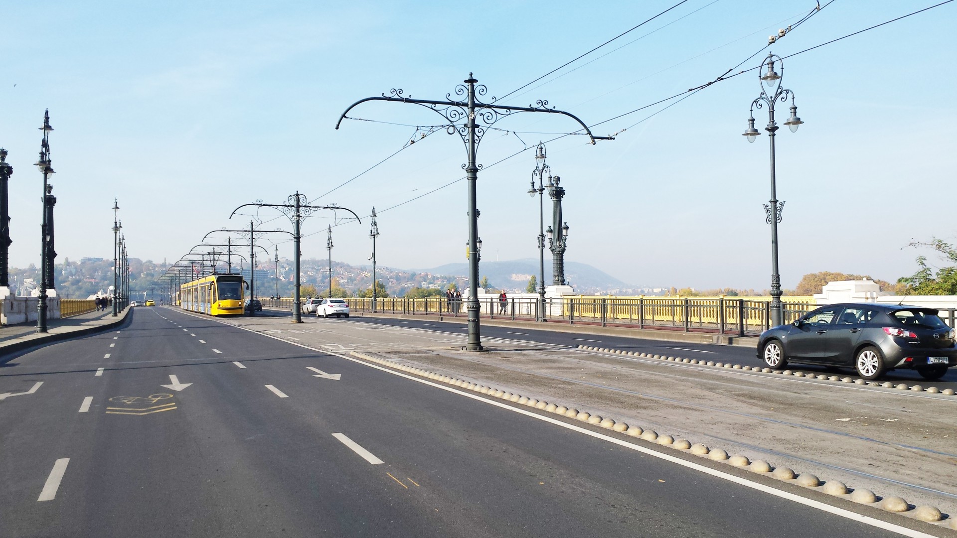 Description: A car is driving down a road with a yellow bus in the background and power lines above it and a yellow bus on the road.