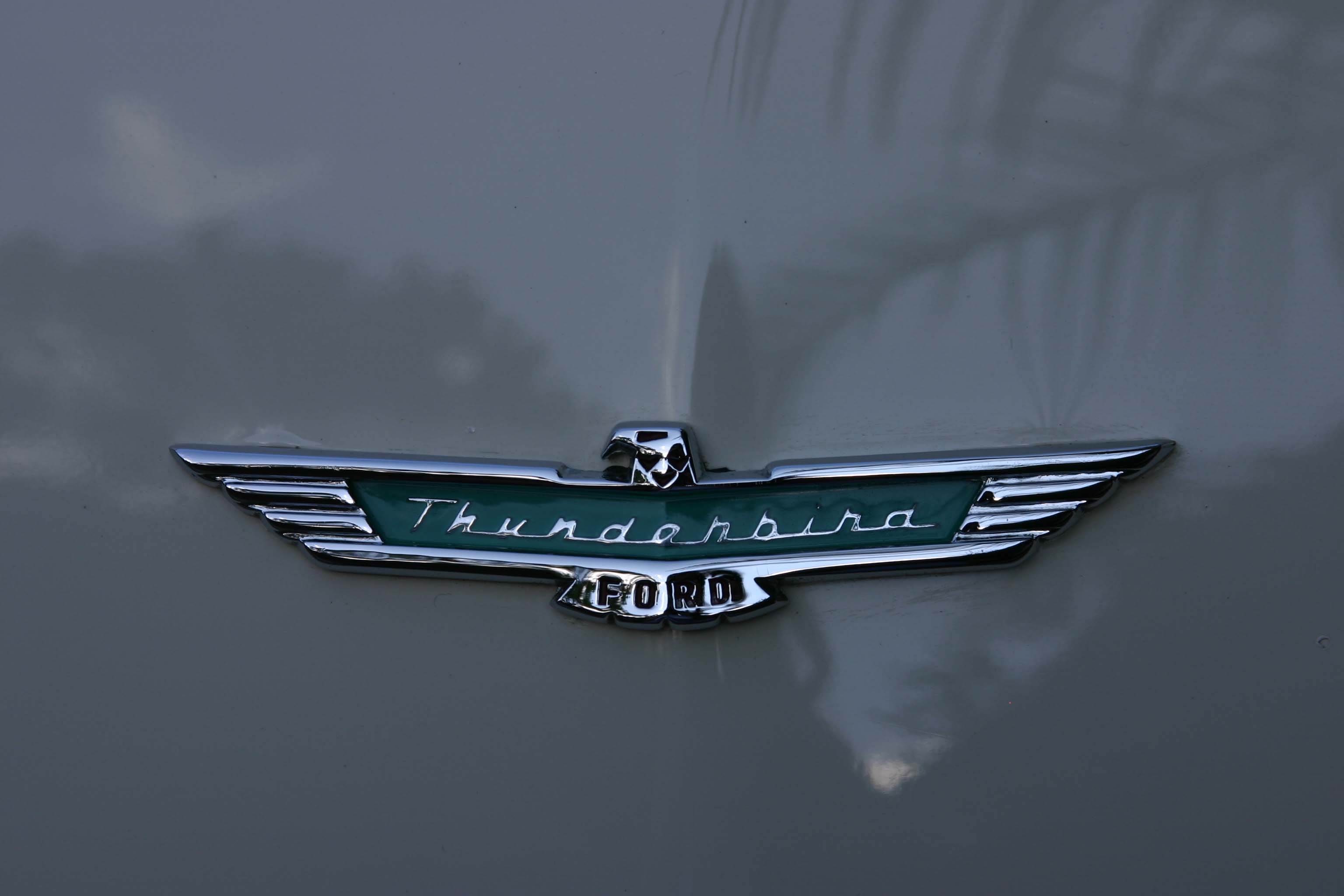 Description: A close up of a car emblem on a car's hood or hood ornament with a palm tree in the background.
