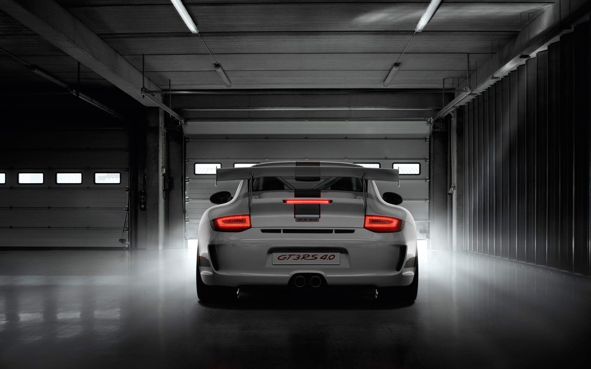 Description: A car parked in a garage with its lights on and the back end of the car illuminated by a red light.