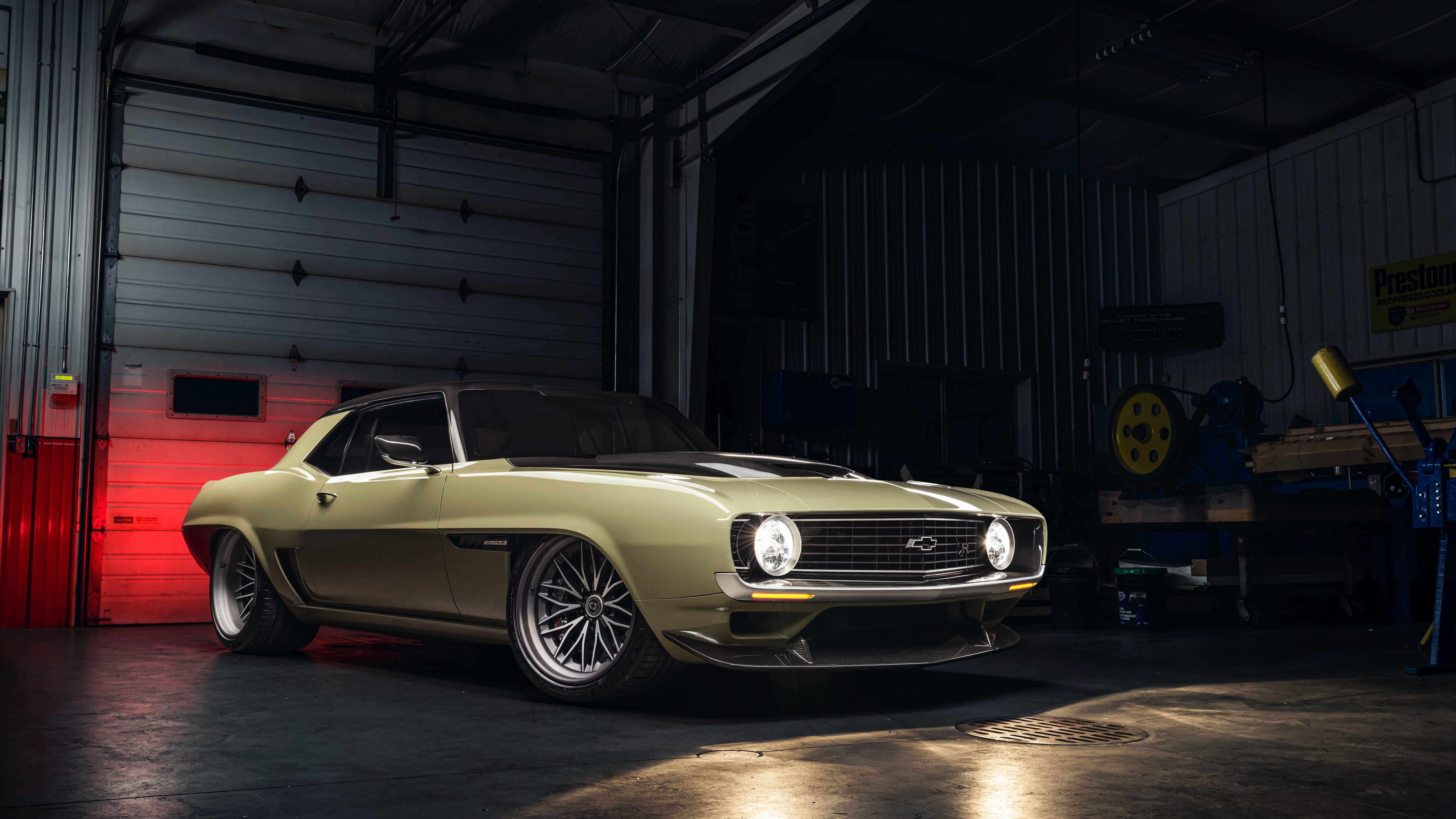 Description: A car parked in a garage next to a red door and a red wall with a red light on it.