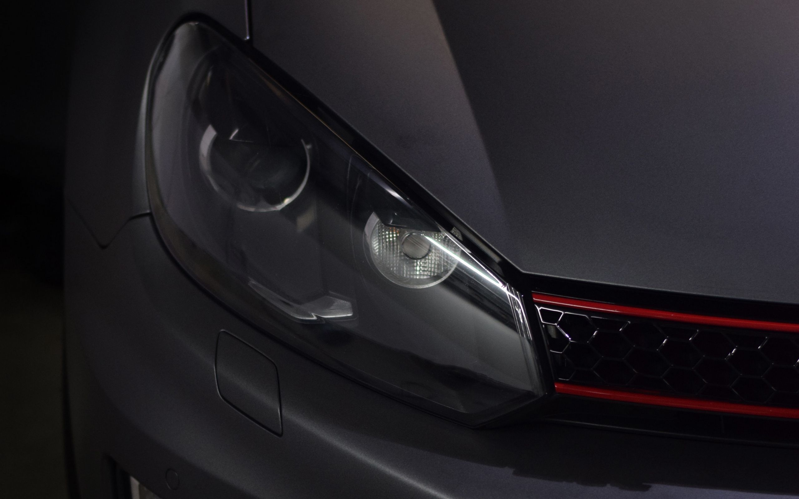 Description: A close up of a car's headlight and its brake lights are visible in the dark room.