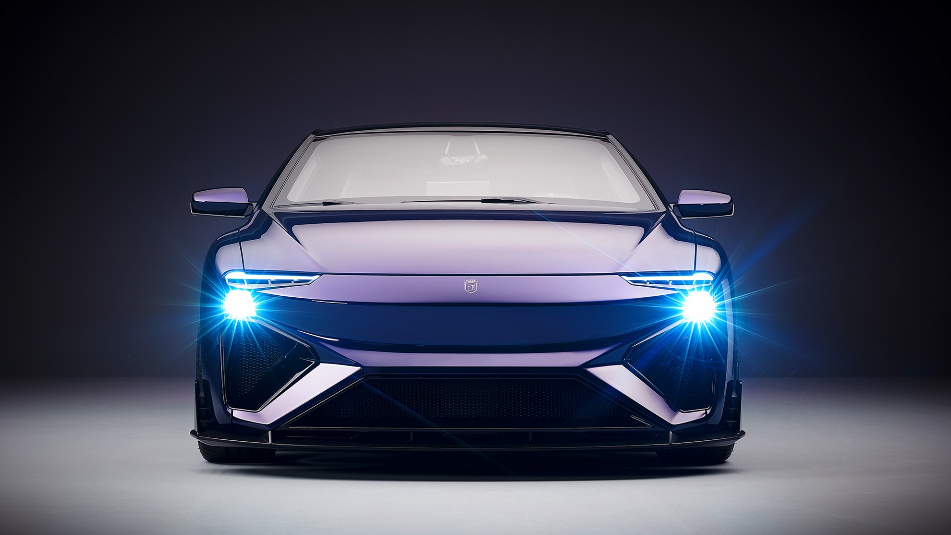 Description: A car with its headlights on and a hood up in the dark with a light on it's headlight.