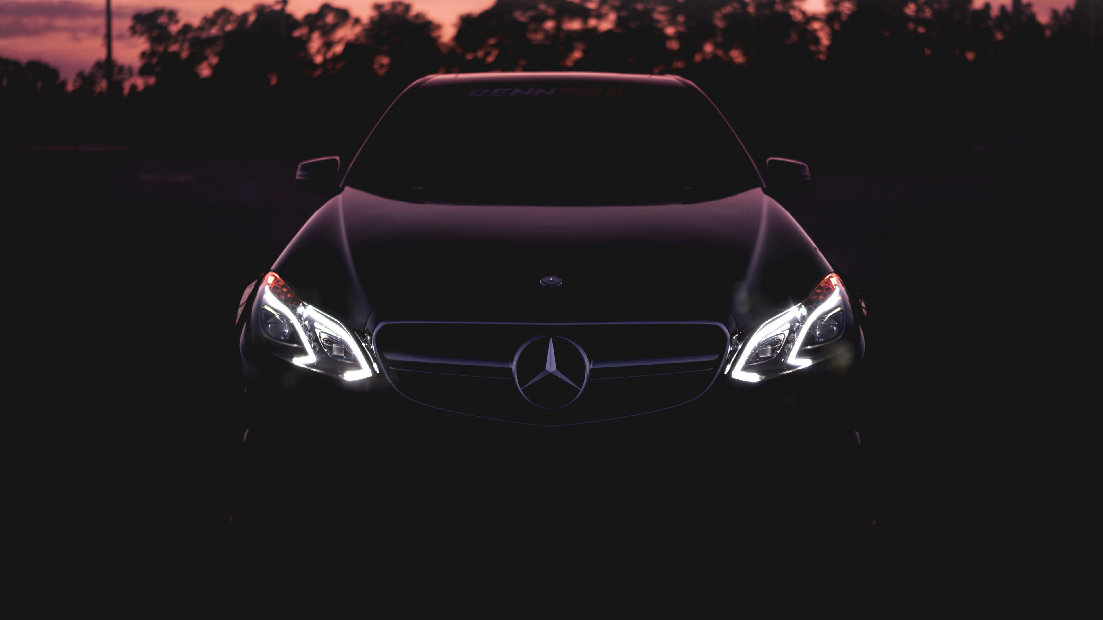 Description: A car is parked in the dark with its headlights on and the sun setting behind it.