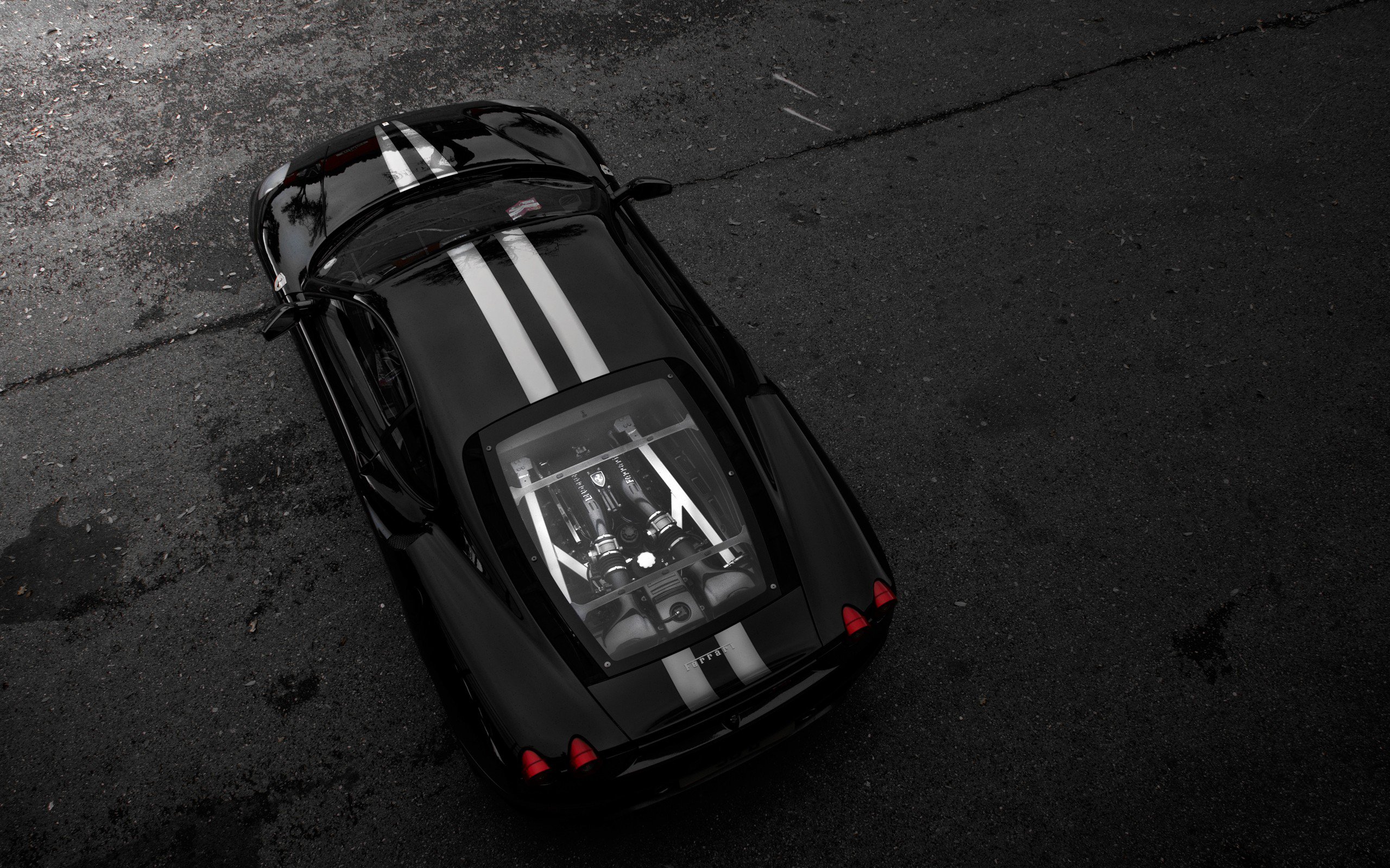 Description: A car with a hood up parked on the street next to a curb with a bike attached to it.