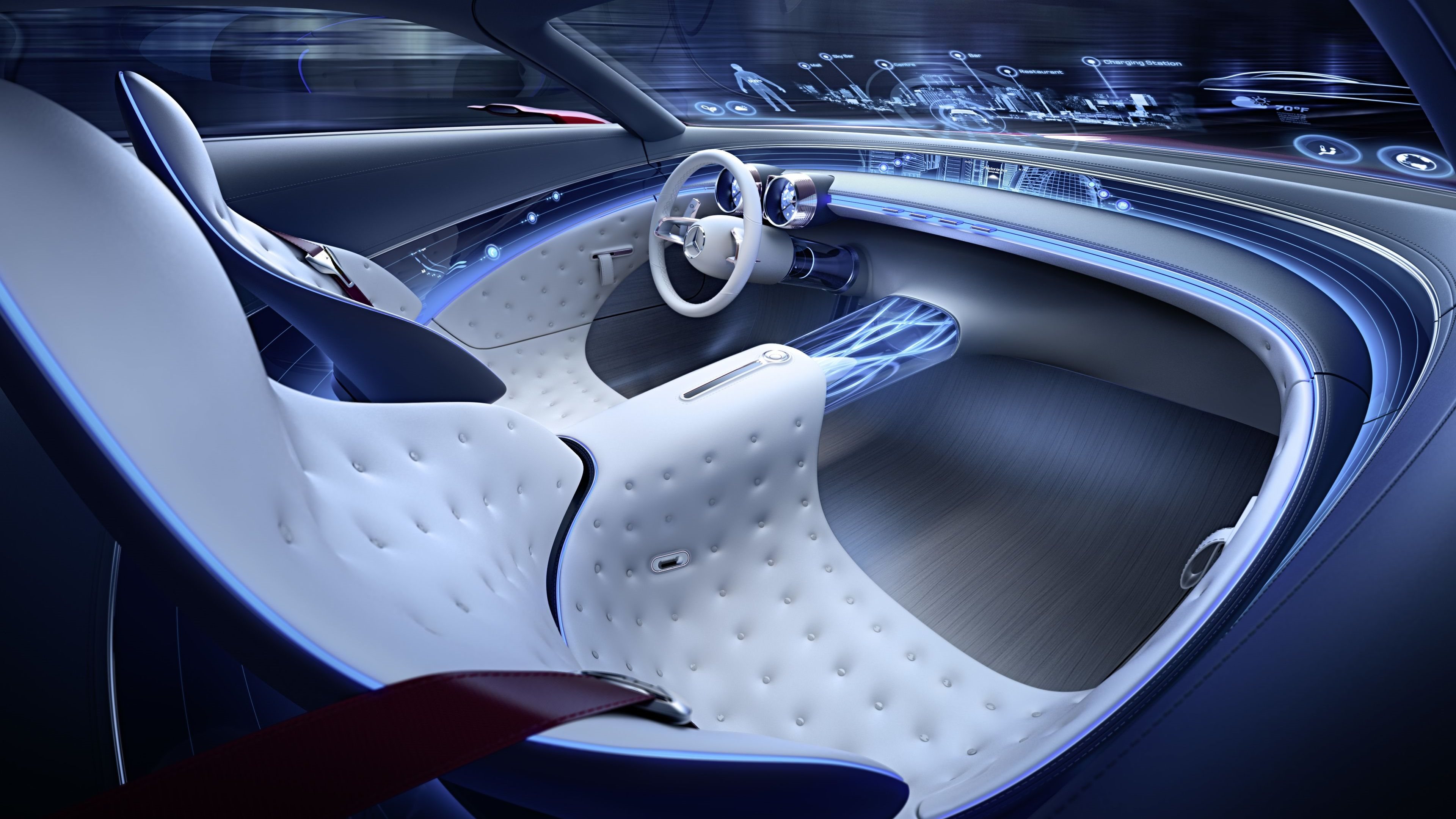 Description: A car interior with a steering wheel and a dashboard with a blue and white interior and a red and white seat.