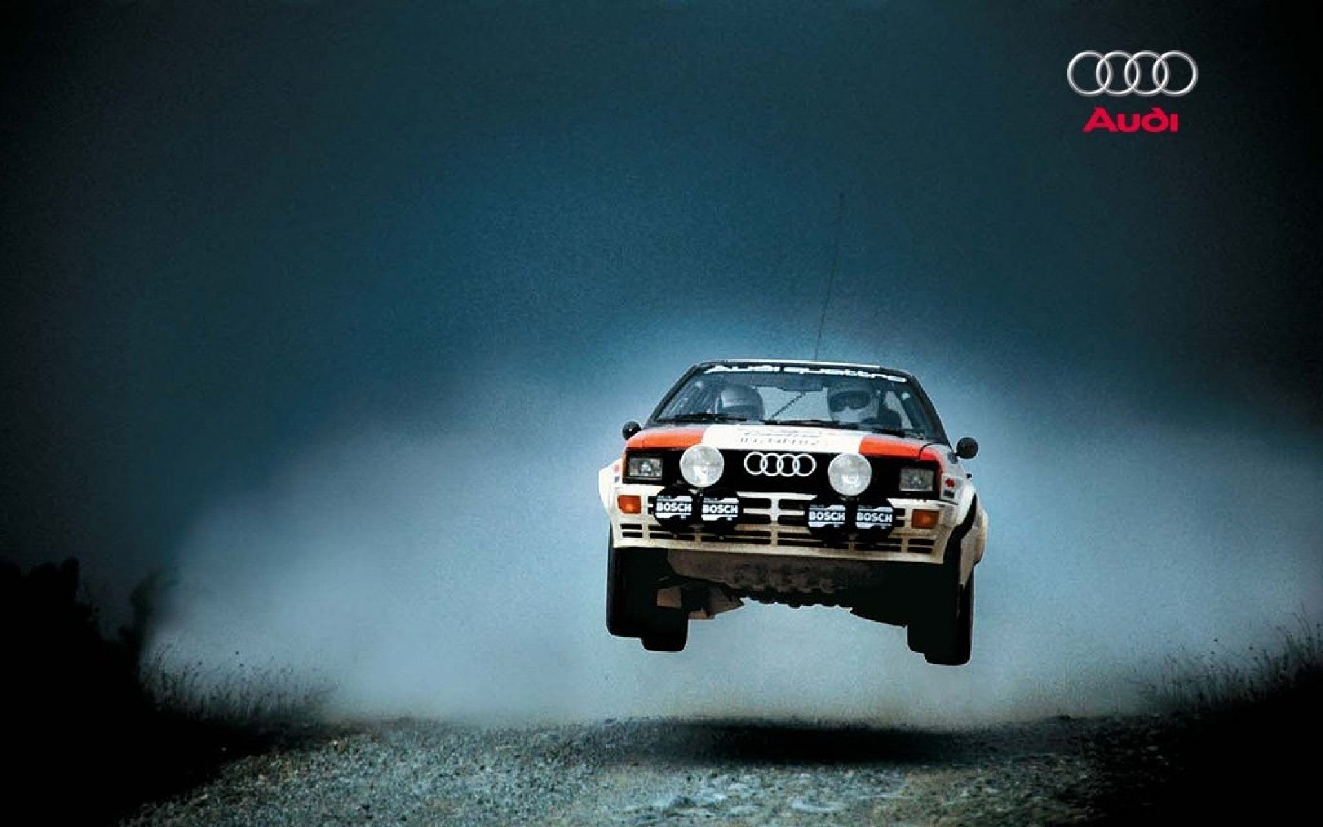 Description: A car jumping in the air with a dark background and a foggy sky behind it.