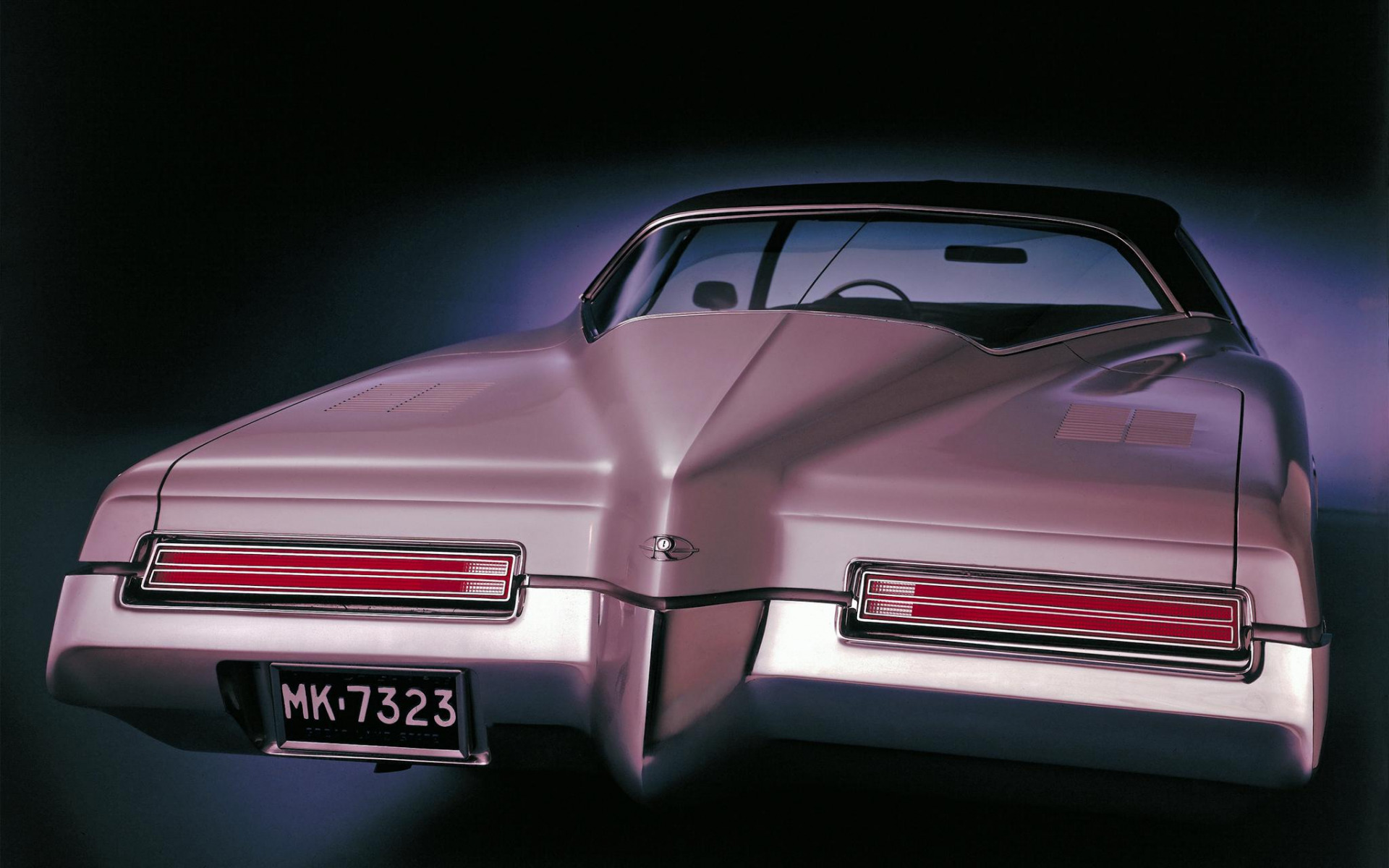 Description: A car with a license plate on it's side in a dark room with a spotlight from the back.