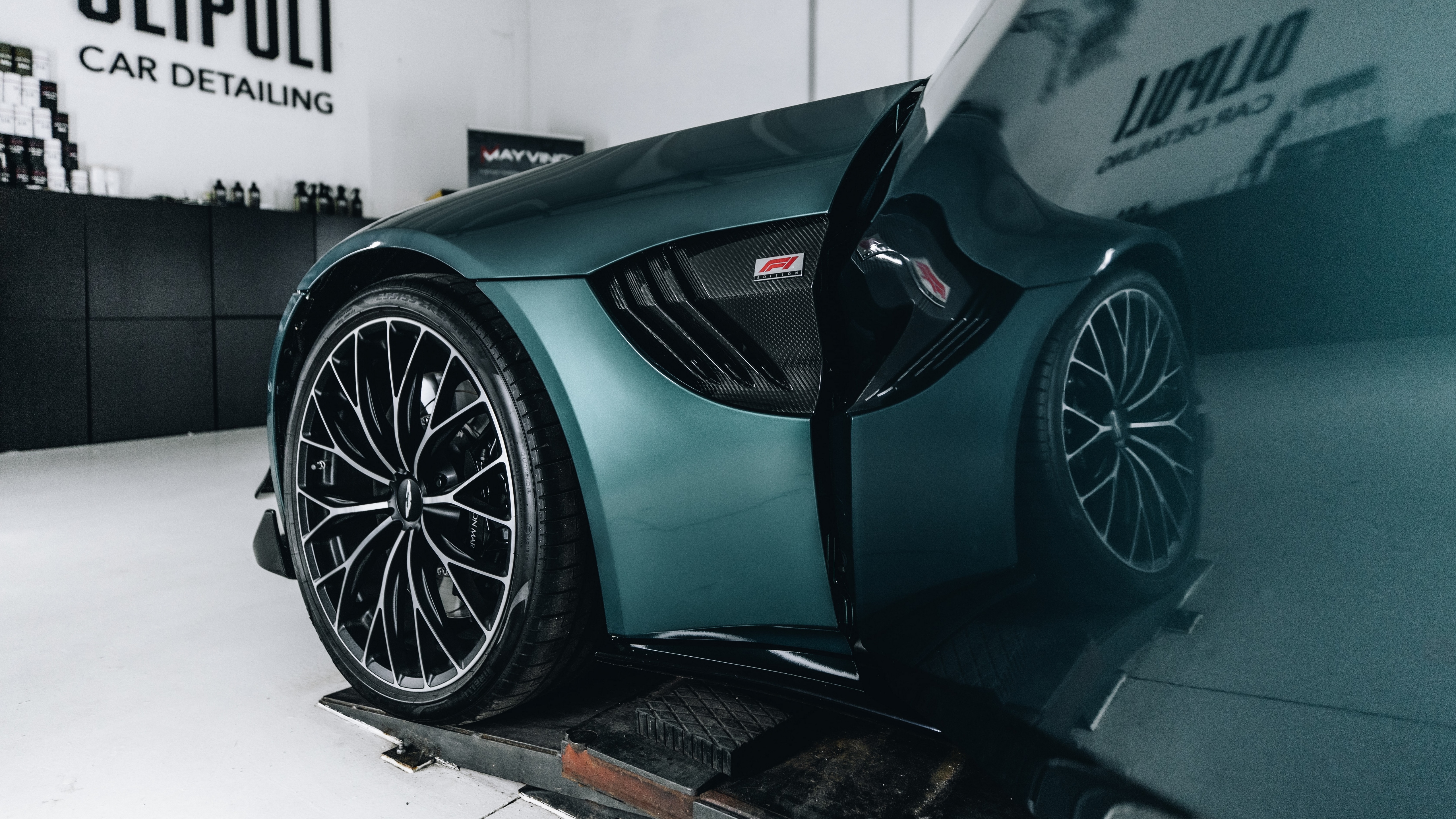 Description: A car is being worked on by a mechanic in a garage with a surfboard on the wall behind it.