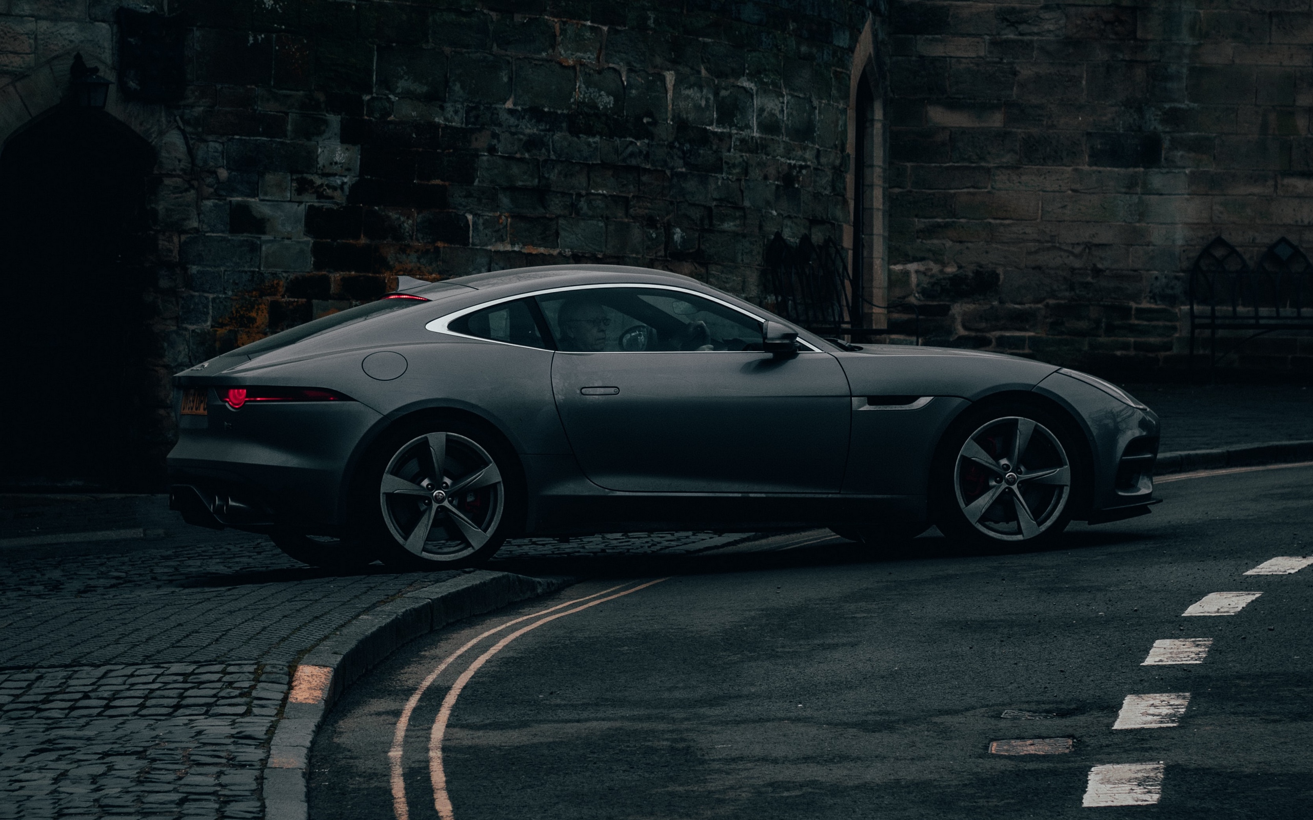 Description: A car parked on the side of a road near a stone wall and a brick wall with a doorway.