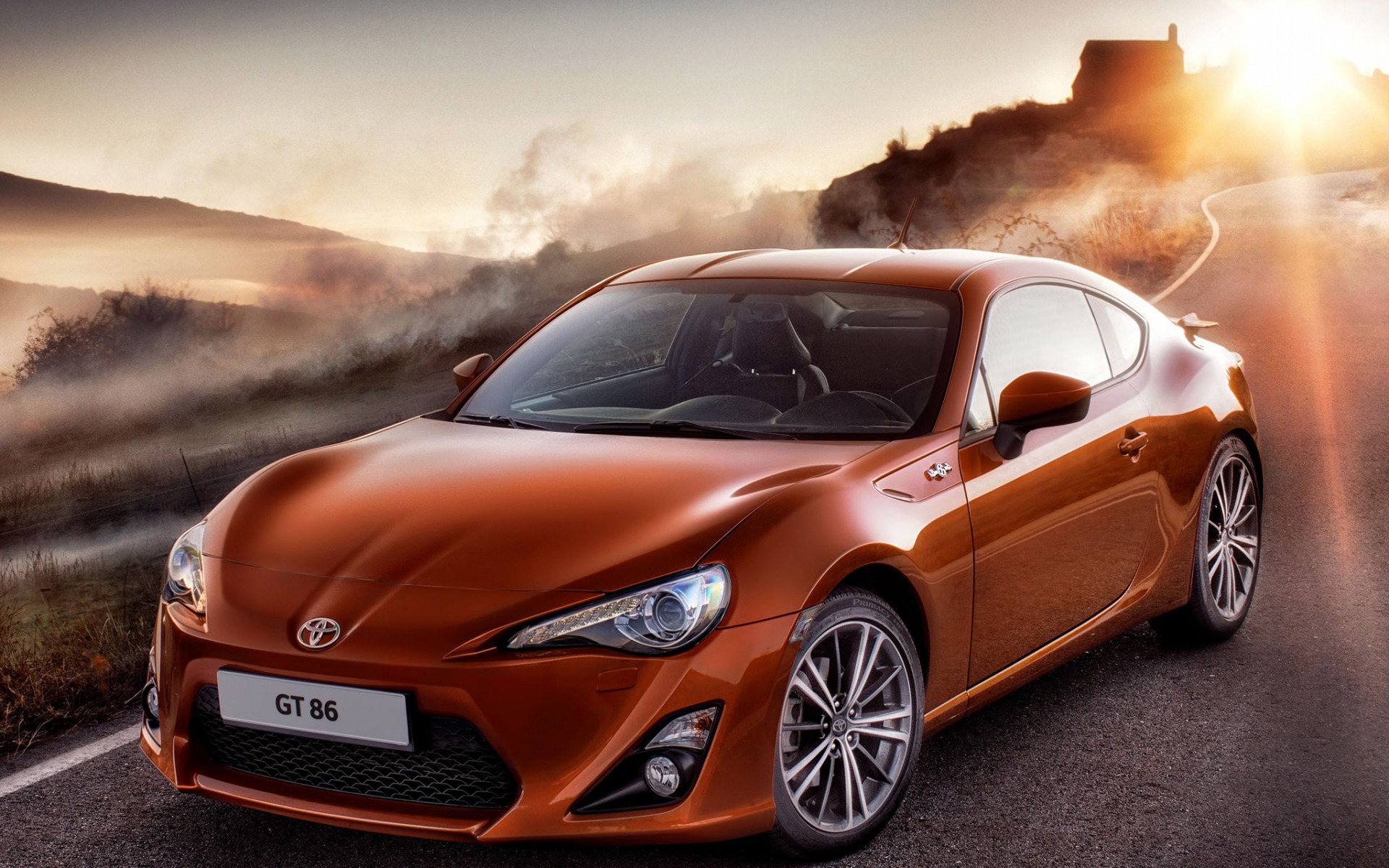 Description: A car driving down a road with a mountain in the background and fog in the air behind it.