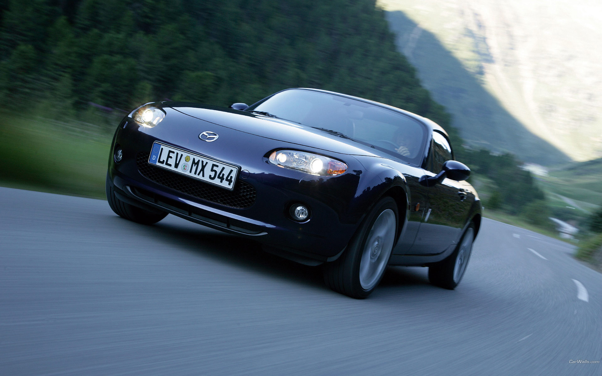 Description: A car driving down a road with a mountain in the background and a sign on the front of the car.