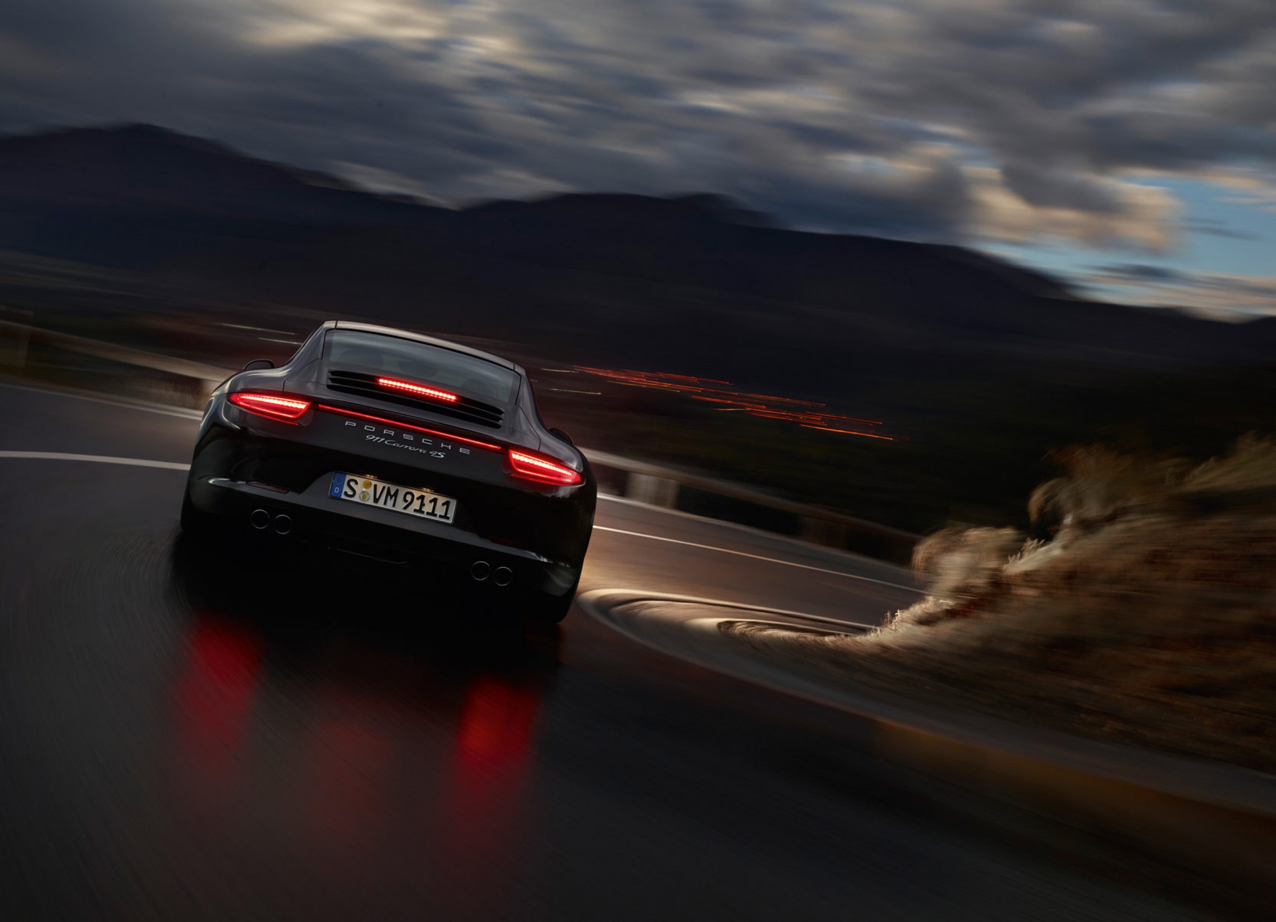 Description: A car driving down a road with mountains in the background at night time with a red tail light on.