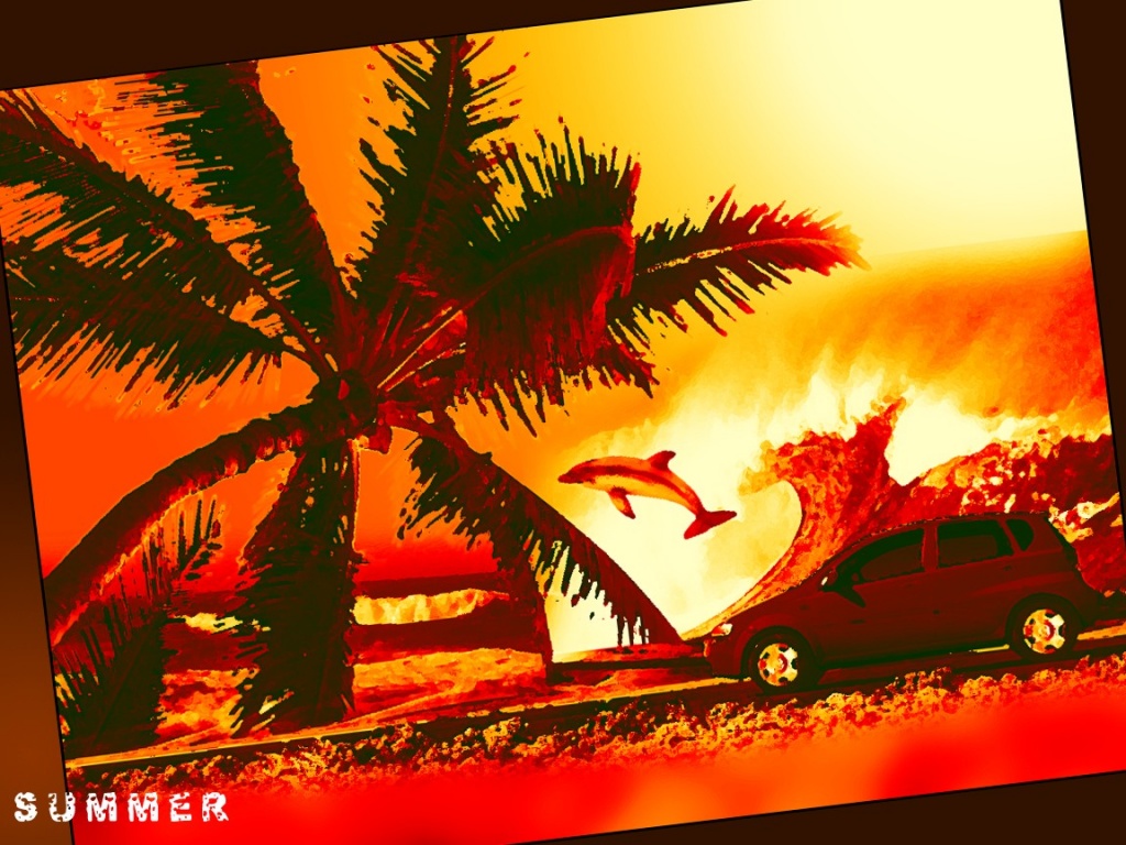 Description: A car parked in front of a palm tree on a beach with a dolphin in the air and a fire in the background.