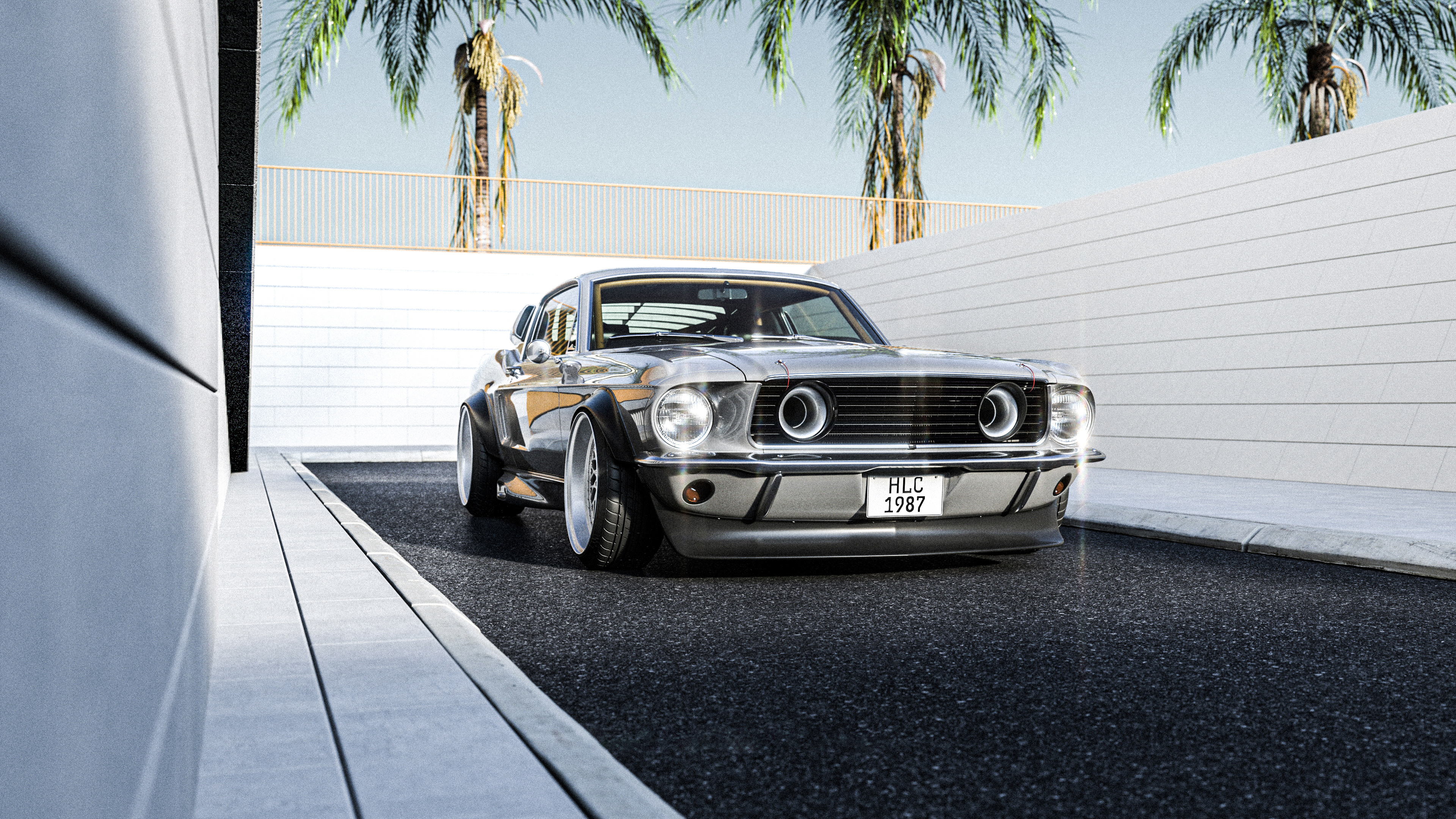 Description: A car parked in a driveway next to a white wall and palm trees in the background.