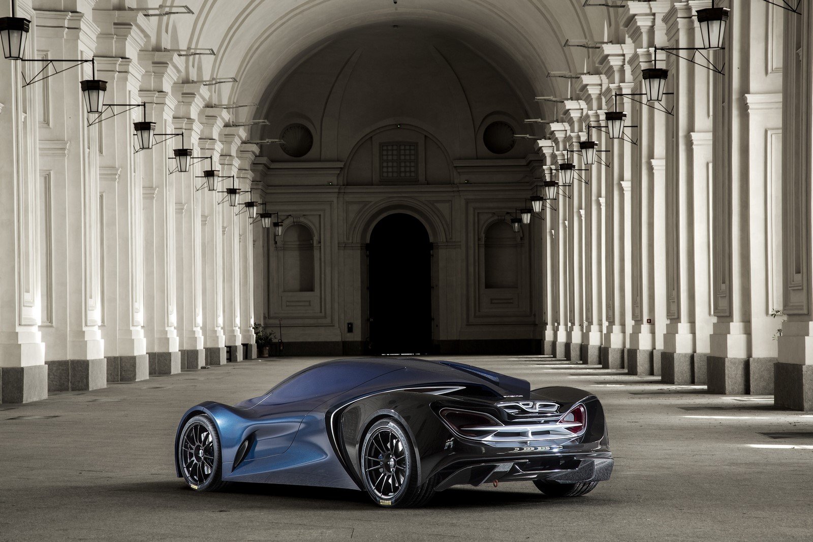 Description: A car parked in a large building with columns and arches on the sides of it.
