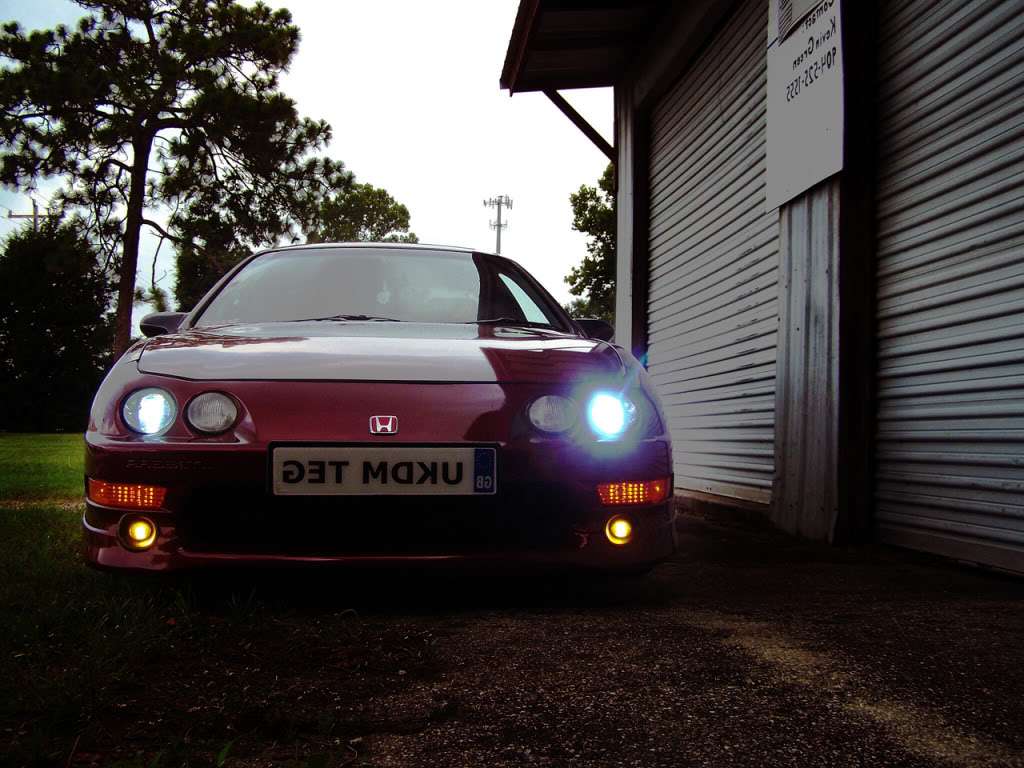 Description: A car parked in front of a garage with its lights on and a sign on the side of the car.