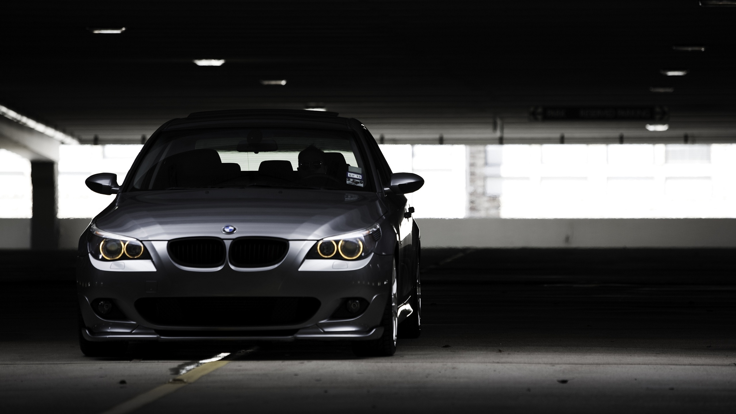 Description: A car parked in a parking garage with its lights on and the hood up and the hood down.