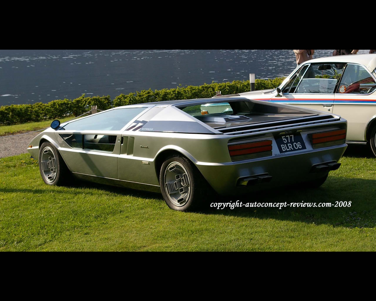 Description: A car parked on a grass field next to a car with a police car in the background and a police car in the foreground.