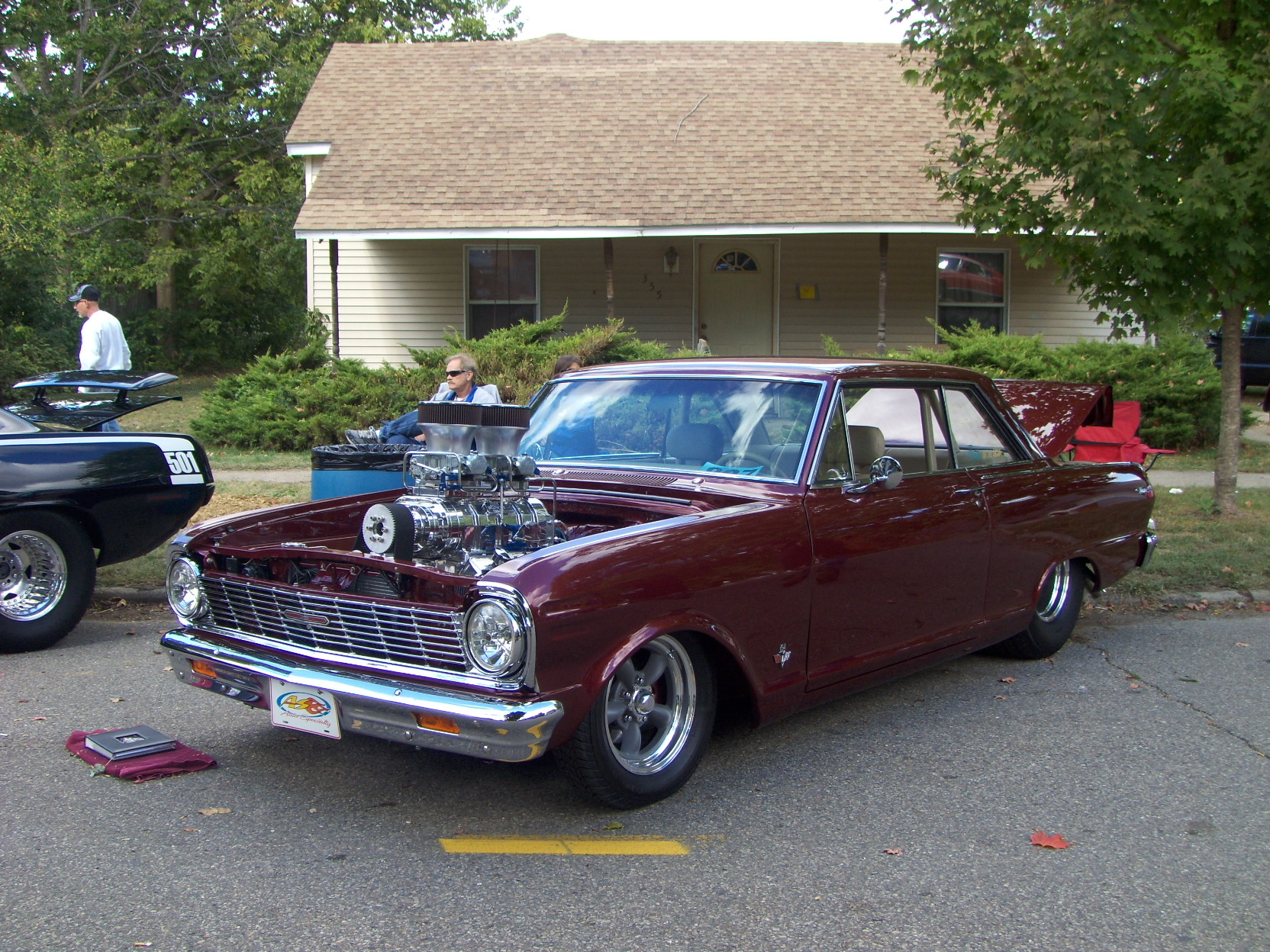 Description: A car parked in a parking lot next to a house with a car engine on it's hood.