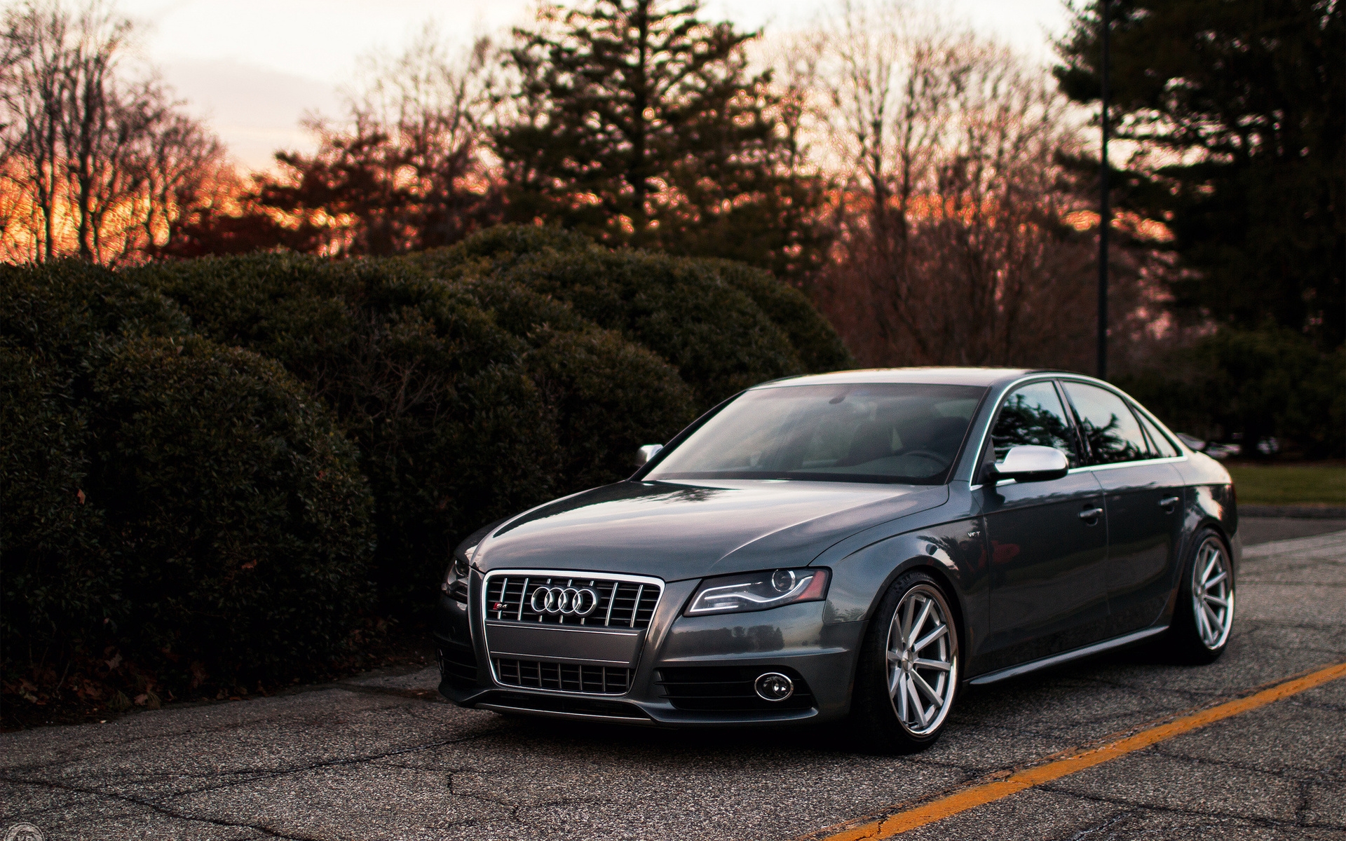Description: A car parked on the side of the road near a bush and trees at sunset or dawn or dawn.