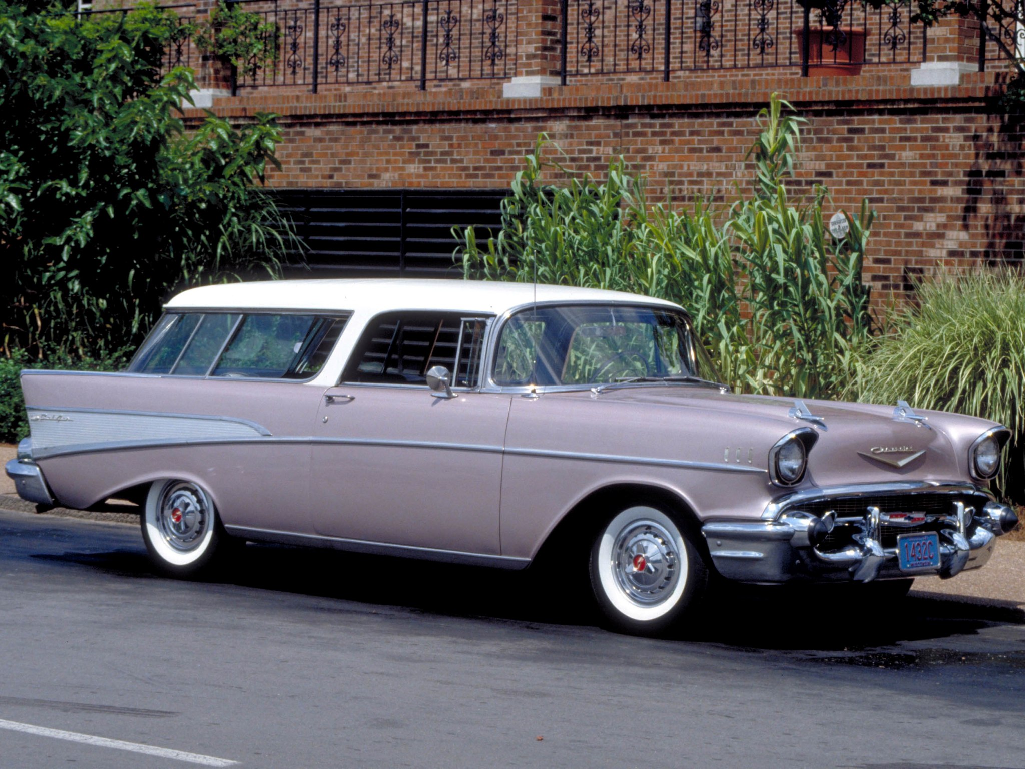 Description: A car parked on the side of the road near a building with a brick wall and trees in the background.