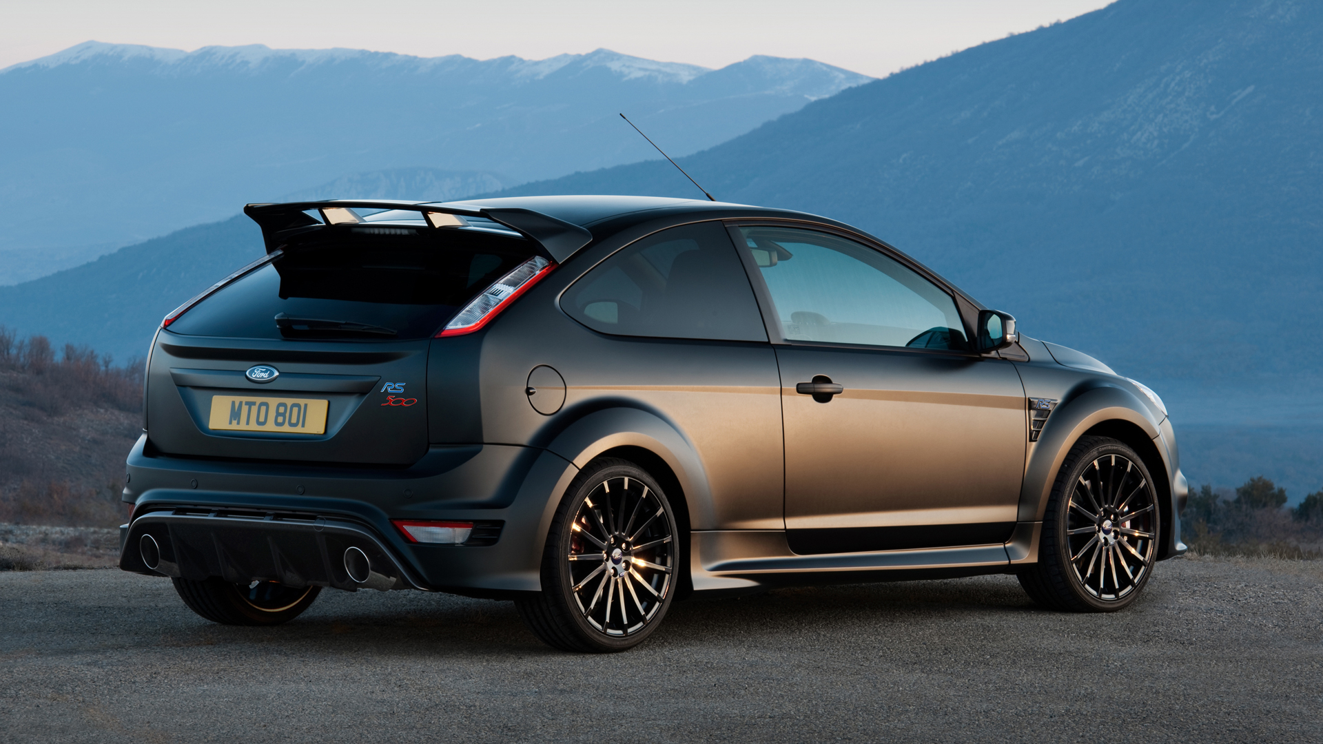 Description: A car parked on a road with mountains in the background and a sky background with clouds in the sky.
