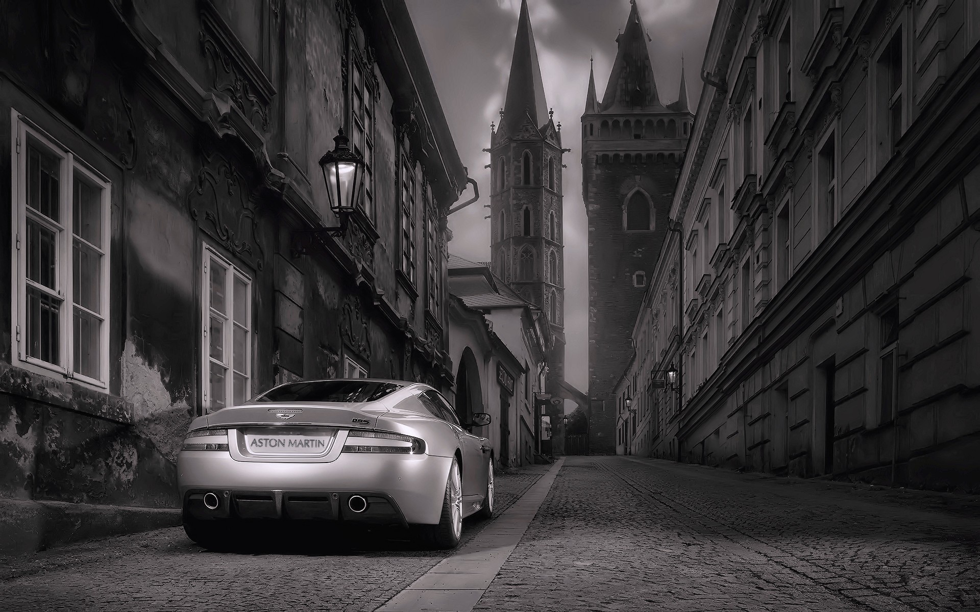Description: A car parked on a street in front of a building with a clock tower in the background at night.